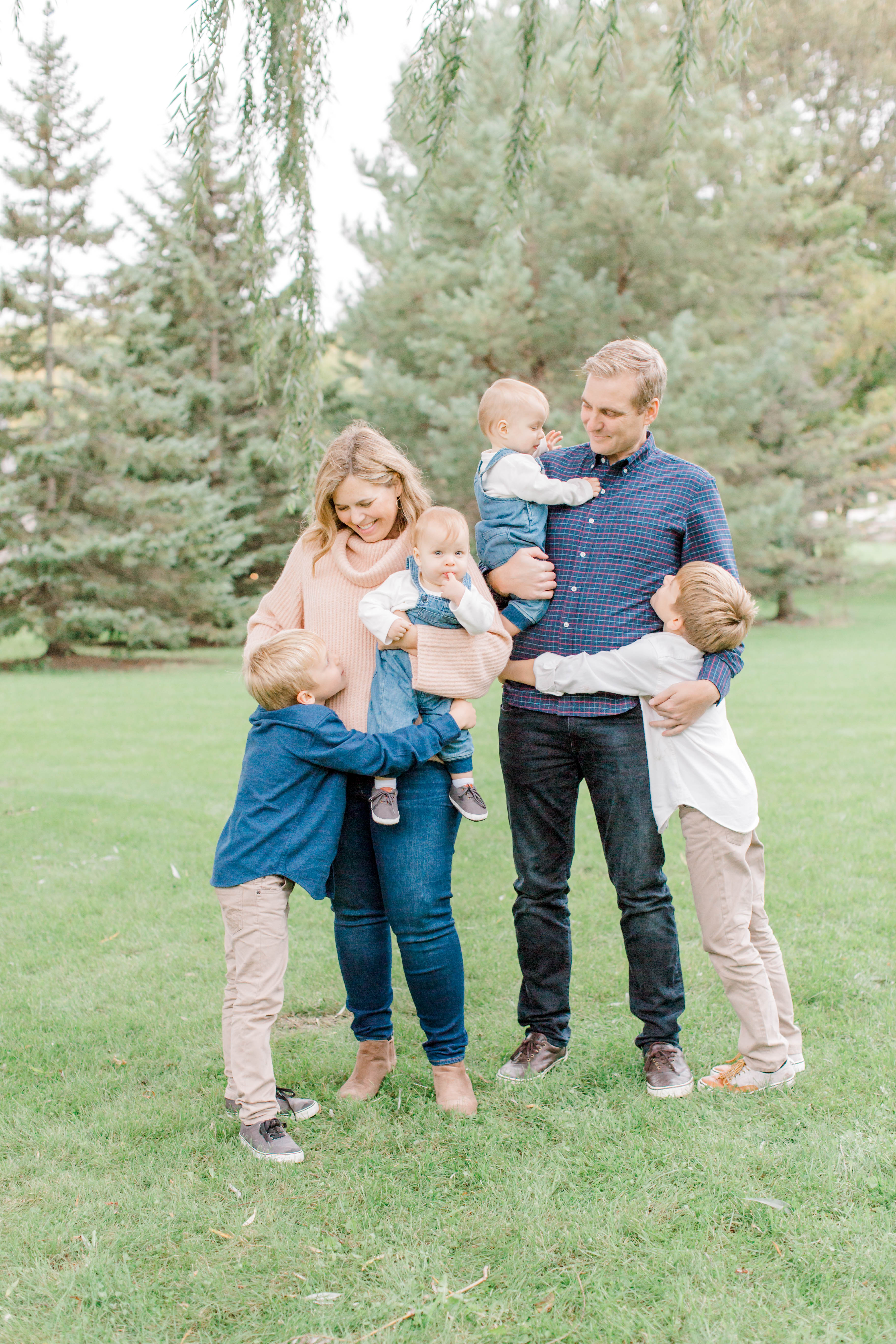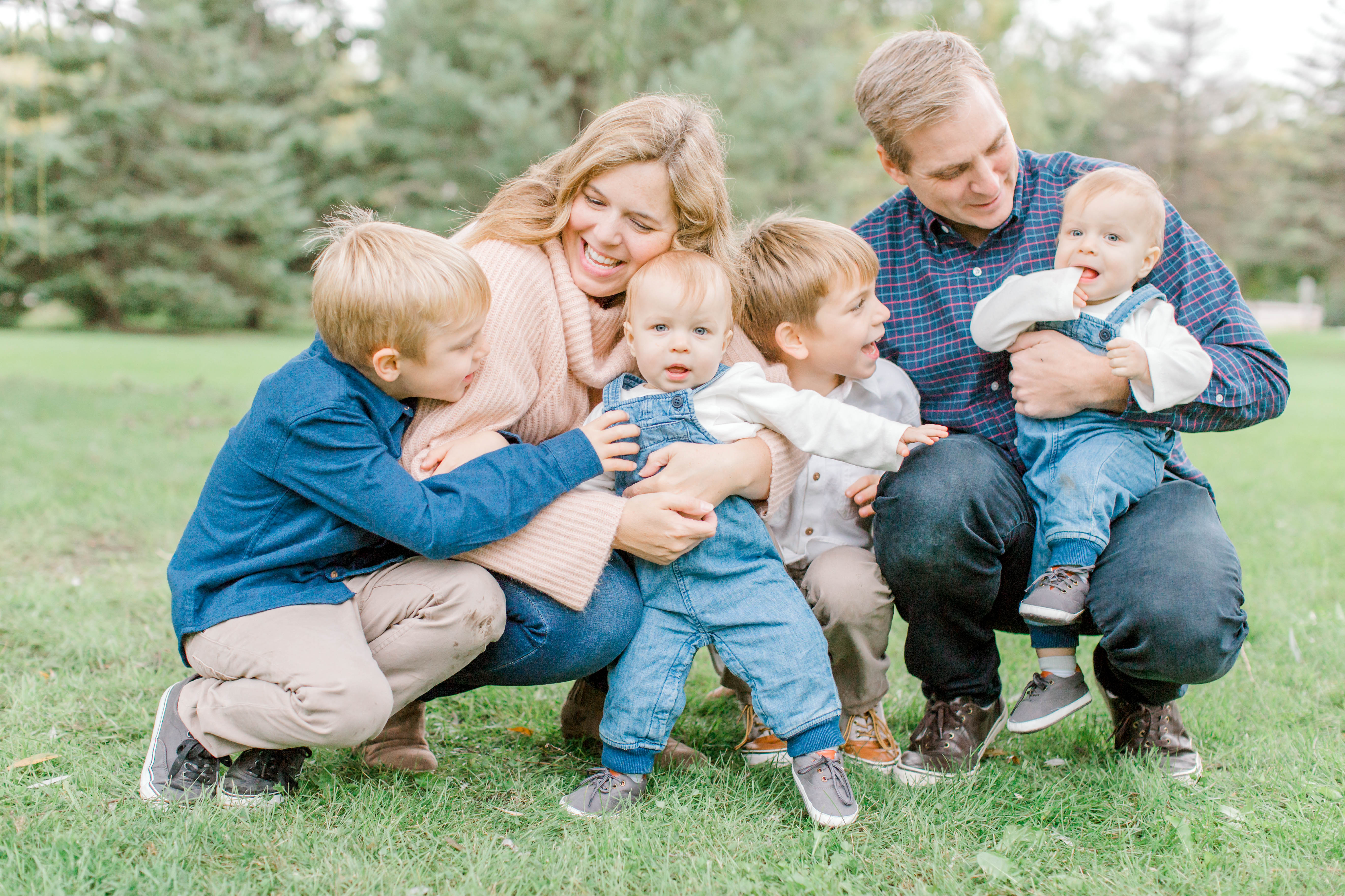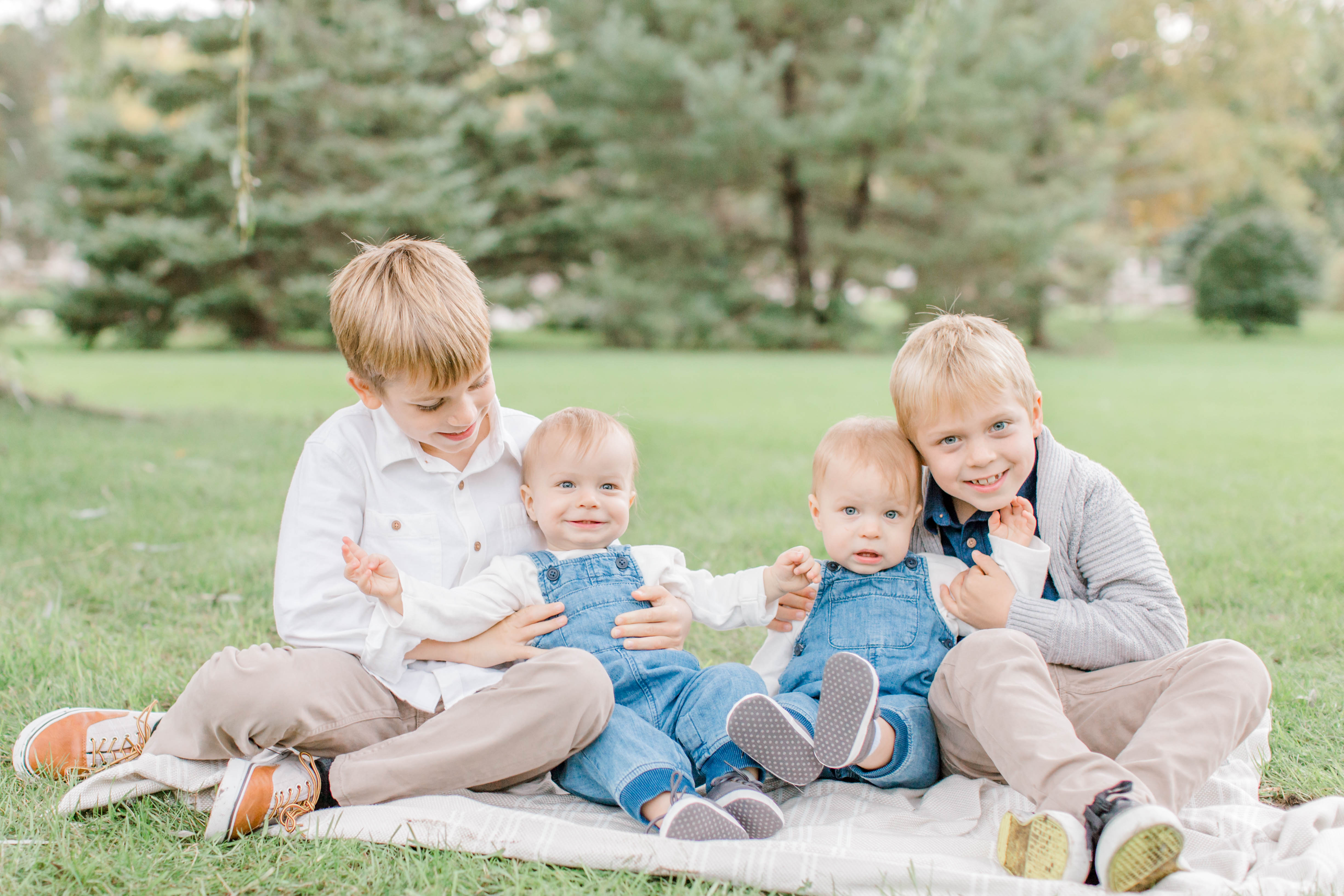 My absolute favorite part was the love that big brothers, Cole and Henry, shared with their little brothers. They are so proud to be big brothers and it definitely shows throughout their newborn session and this family session. Henry and Cole couldn’t stop giving them kisses!! All of the boys had so much fun laughing, snuggling, and playing on the blanket in the grass. And who can forget the two little stars of the show?! Gus and Louise were so sweet in their matching denim overalls and they loved sharing smiles with their big bros.