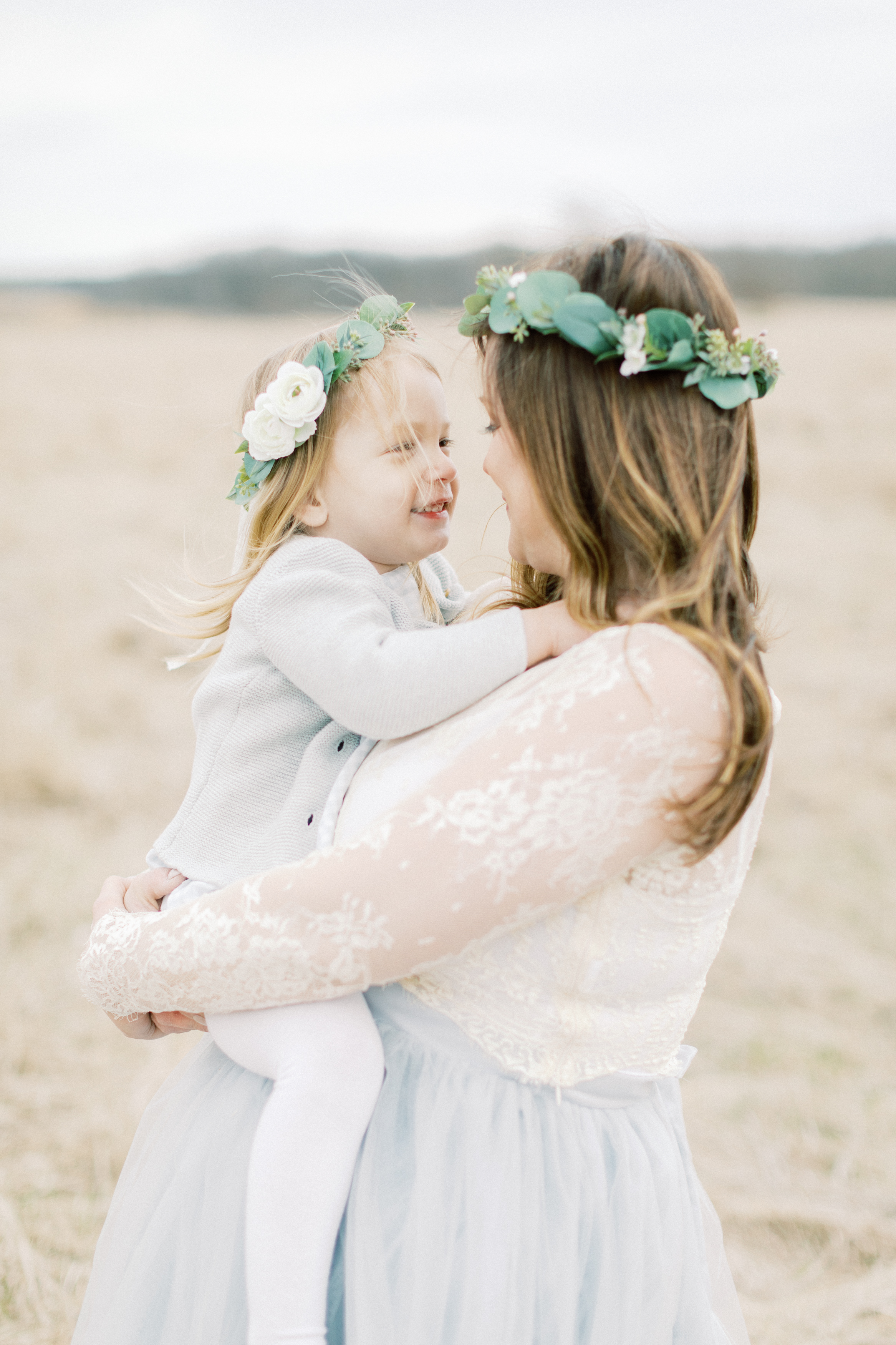 This maternity session made my creative soul so happy! This session was a part of a traveling dress project with about 12 other photographers across the nation! We shared the purchase of this incredible skirt and each took a turn photographing the skirt with our own creative vision. I knew right away when I saw the skirt that I had to put a glowing pregnant momma in it! My vision for the skirt was to stay on brand with just a little extra glam! So I ordered a stunning feminine lacy top, a beautiful ranuncula filled floral crown (with a matching mini crown for sweet little Avery), and lined up a wonderful makeup artist (Melissa from JJ Allen Beauty).