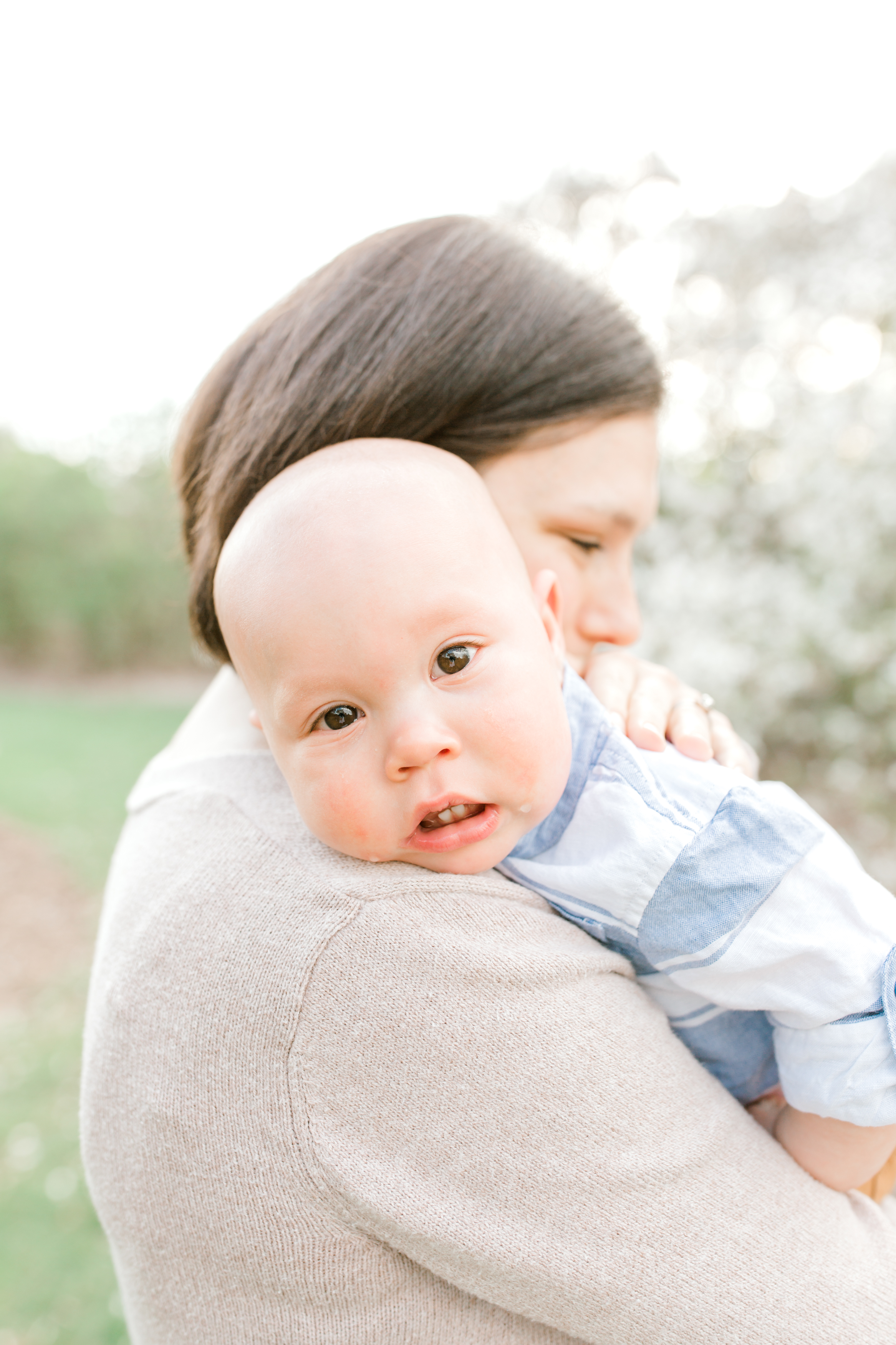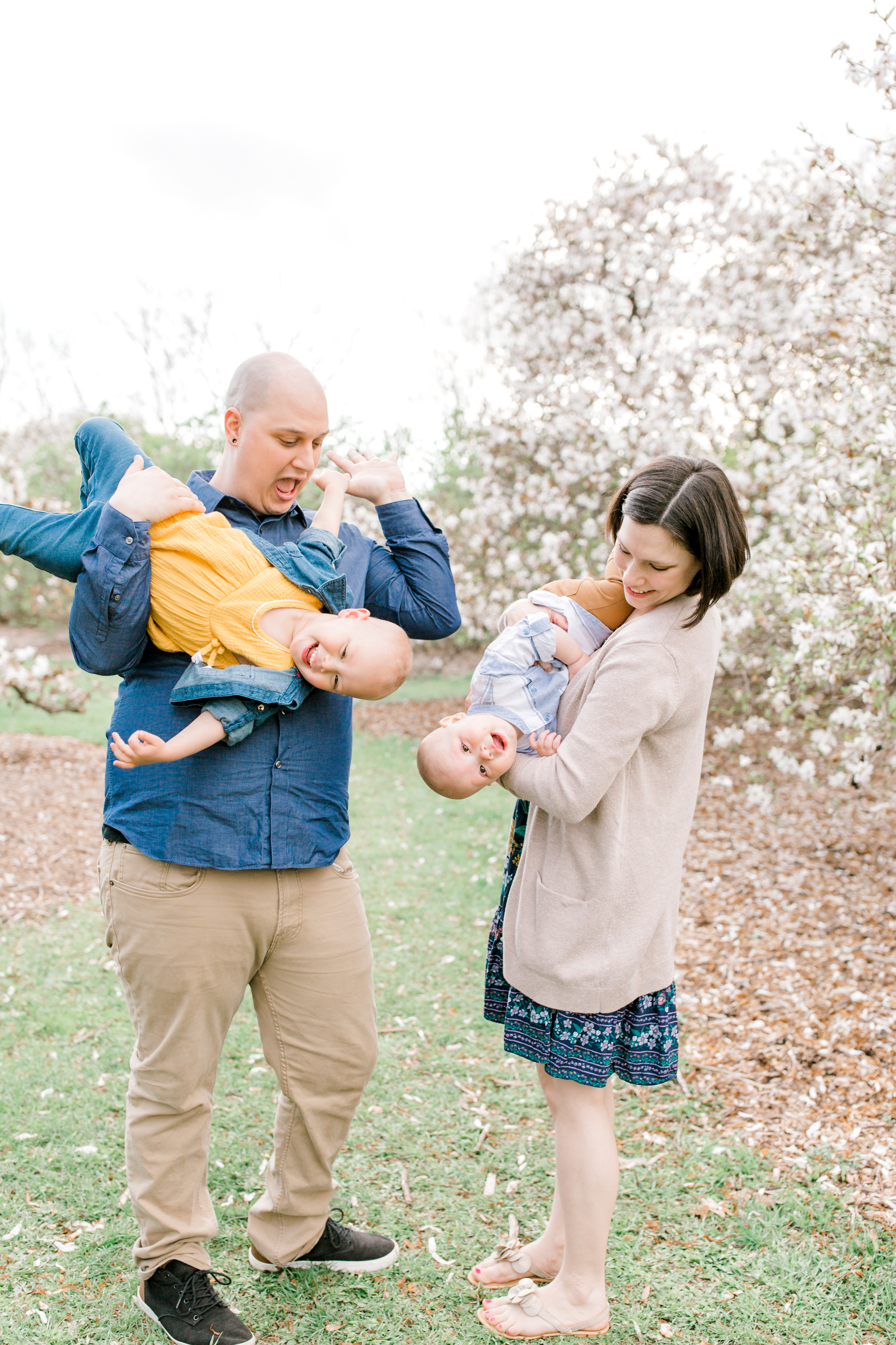 The McNeill family was so sweet and were far from being shy. Normally it takes a few minutes for families to warm up, but not this crew! They jumped right into the fun! I set them up under a beautiful blossoming tree and told them I was just testing my light… but the very first frame was a keeper with little Cash being held upside down by his dad (see the first image below!)! I had so much fun chasing around little Miss Greenley and baby Cash! Greenley is such a loving big sister and planted lots of kisses on baby Cash’s cheeks. The bond that this family has is very special and radiated throughout the whole session.