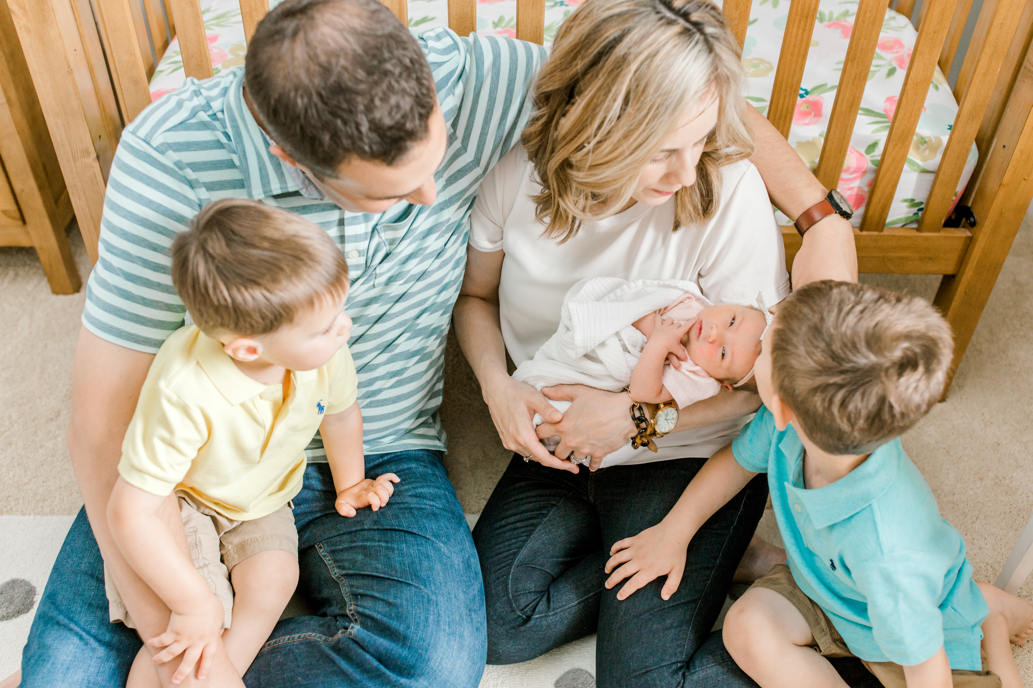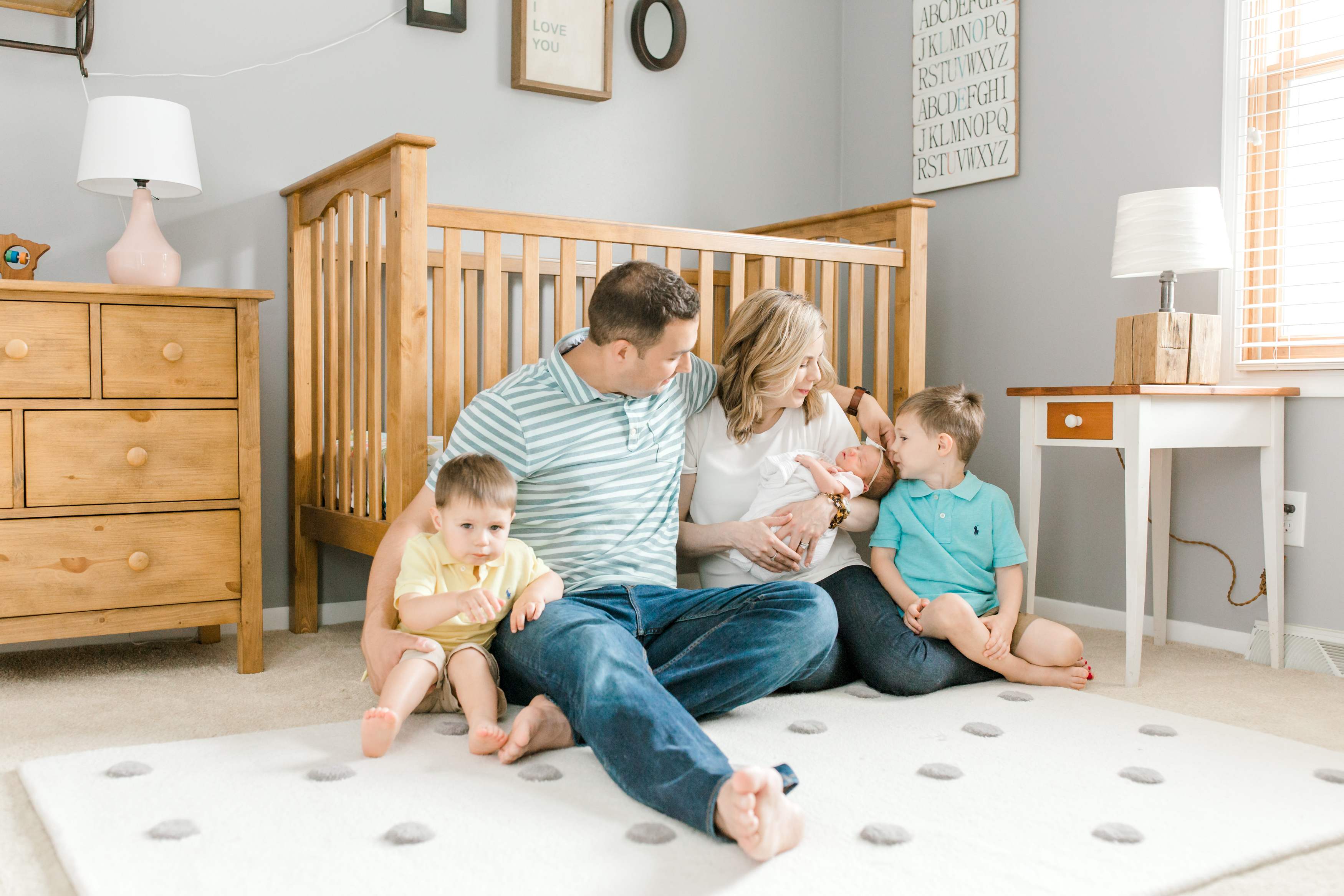 I met this family of five at their home in Germantown, Wisconsin for their newborn session with their third little one. After two boys, this momma had a little girl! With three little ones 4 and under, she has her hands full, but I could tell that her heart was even more full. Big brother Cullen was so proud of his new sister and had no problem holding her gently and giving her lots of love. And Sweet Lane, well he was still adjusting to the thought of not being the baby of the family anymore.