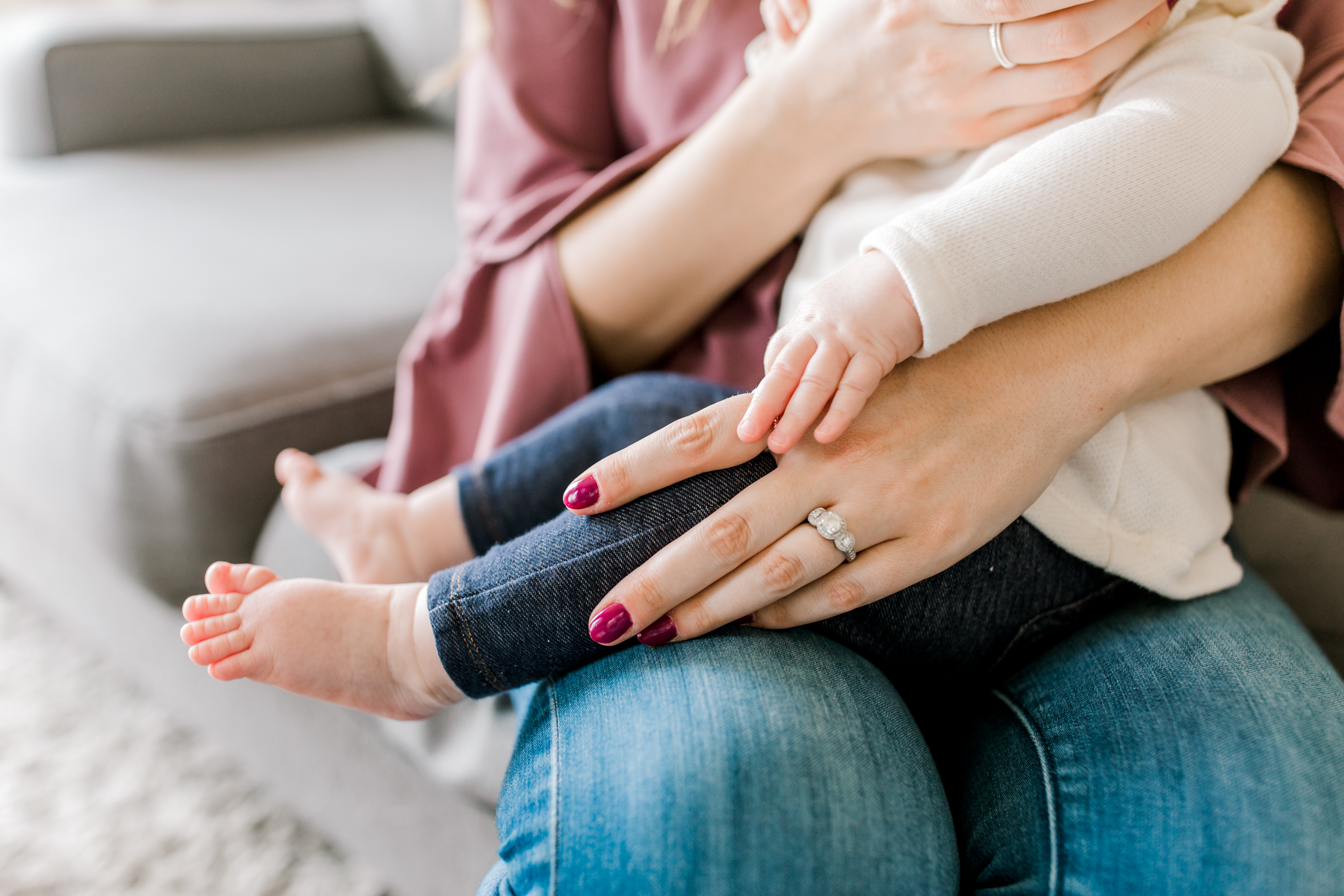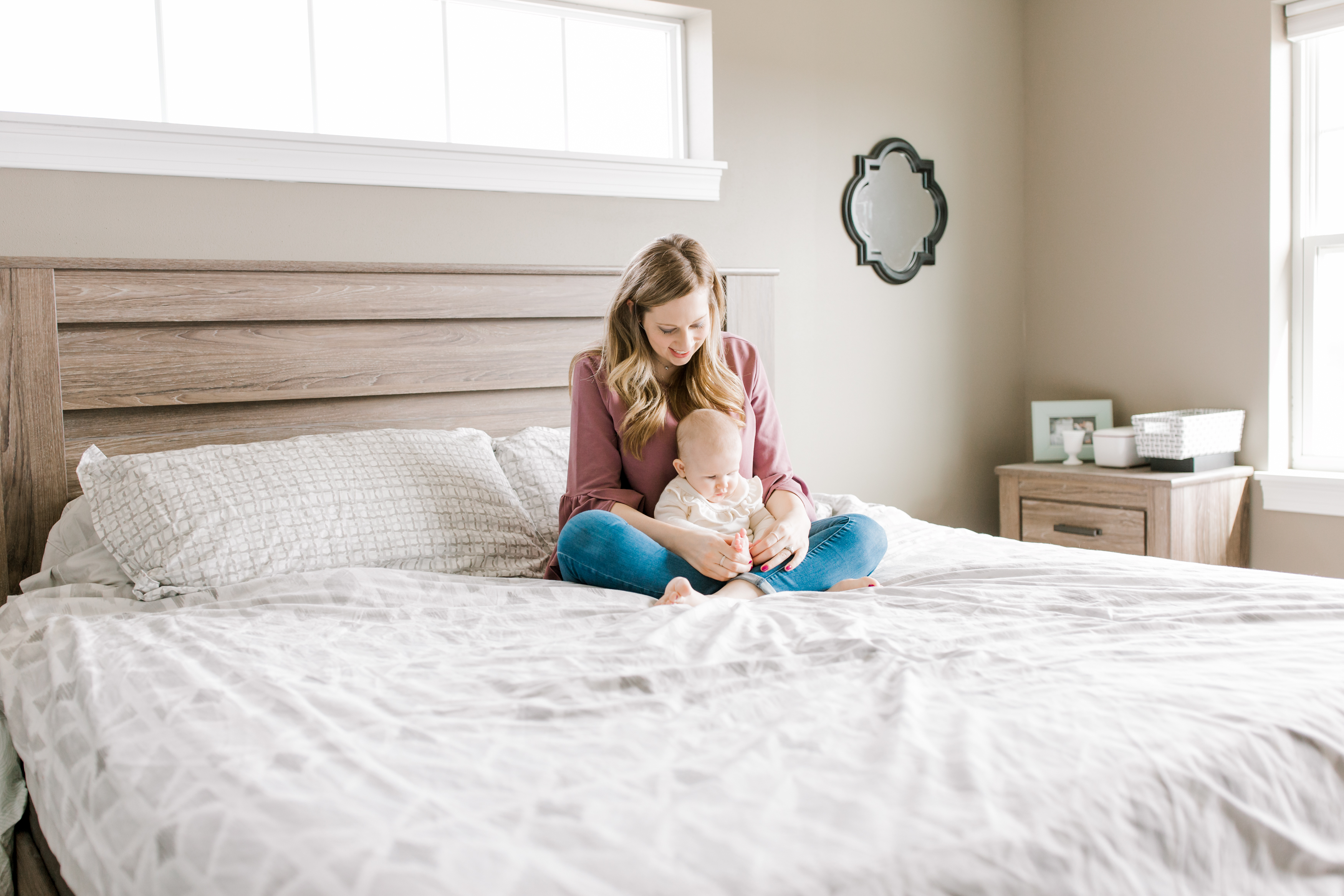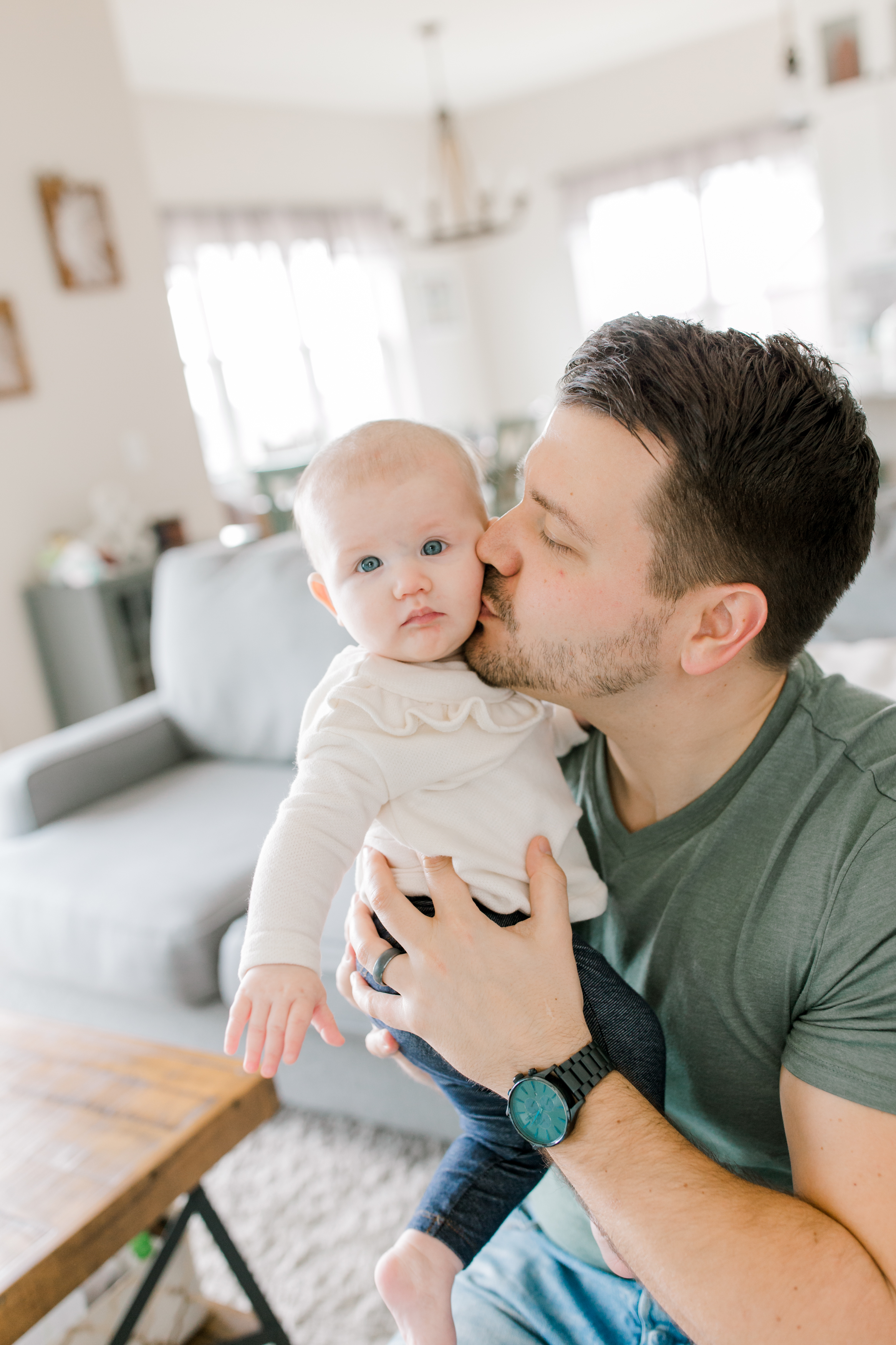 I met the Kimmerle Family at their beautiful home in Menomonee Falls for their lifestyle family session to celebrate their baby girl, Penelope, turning 6 months old. Just 6 months prior, I had done her newborn photos and I cannot believe how big she has gotten (see her newborn session here!). It is always such a pleasure to get to watch your littlest clients grow and to capture them in all of these adorable stages! It reminded me of my son, and how it is important to cherish these moments with our children through these different stages in life. One of the things that I loved about the session was the love that Ashlie and Max share with their daughter, which radiated throughout the room and photoshoot.