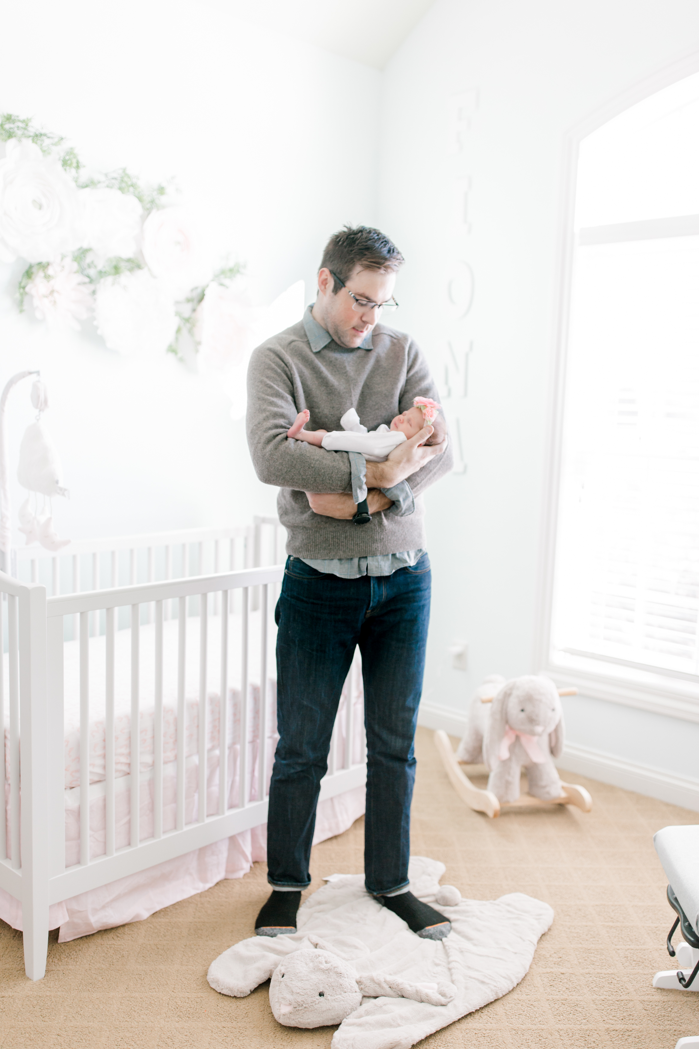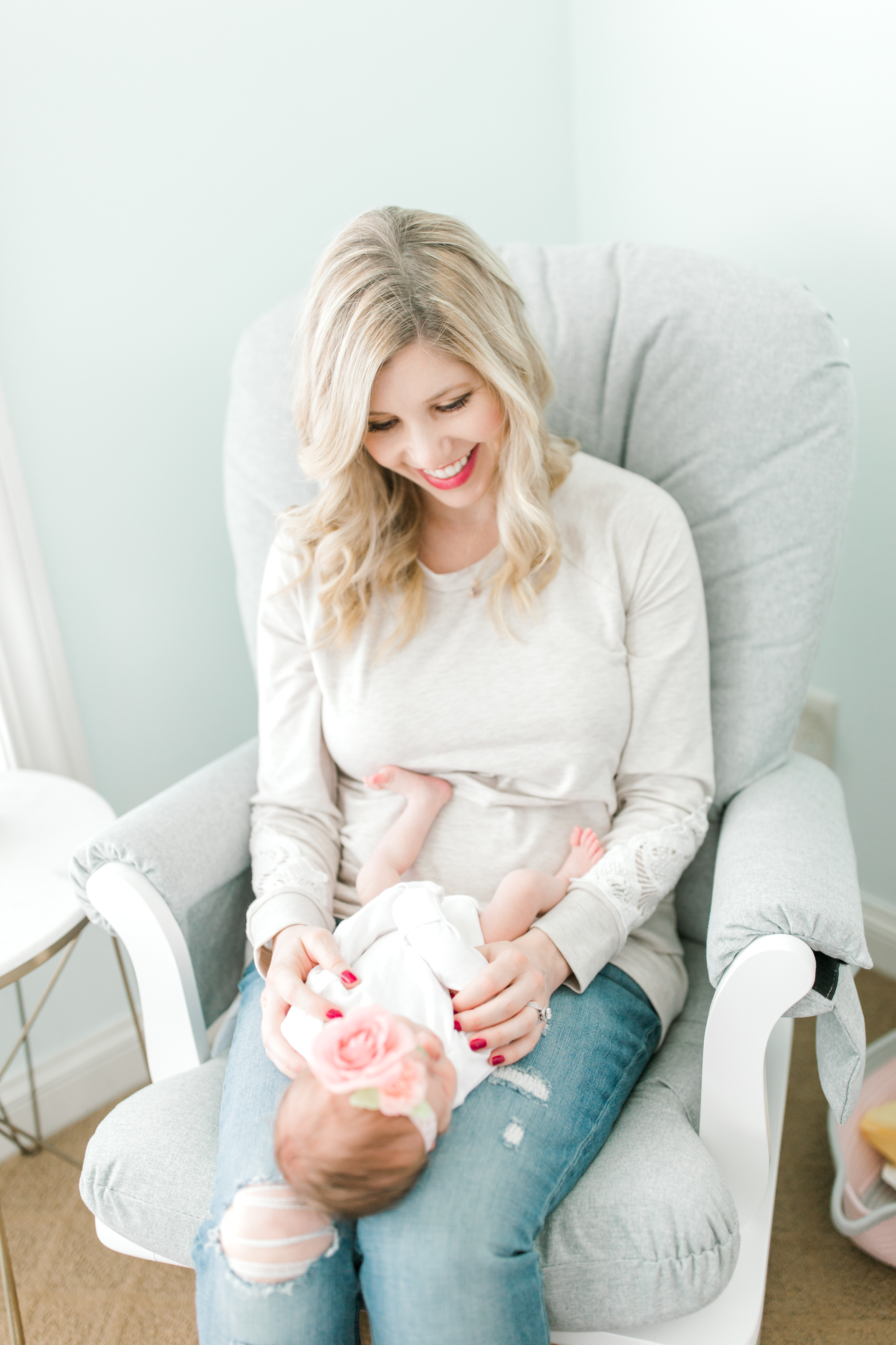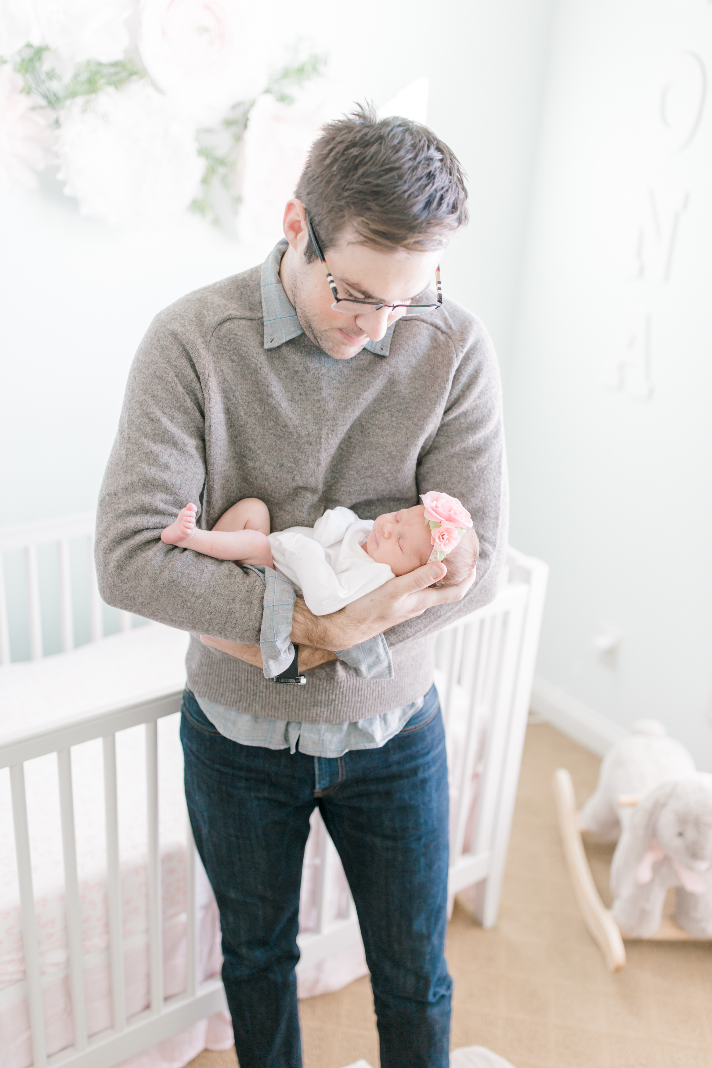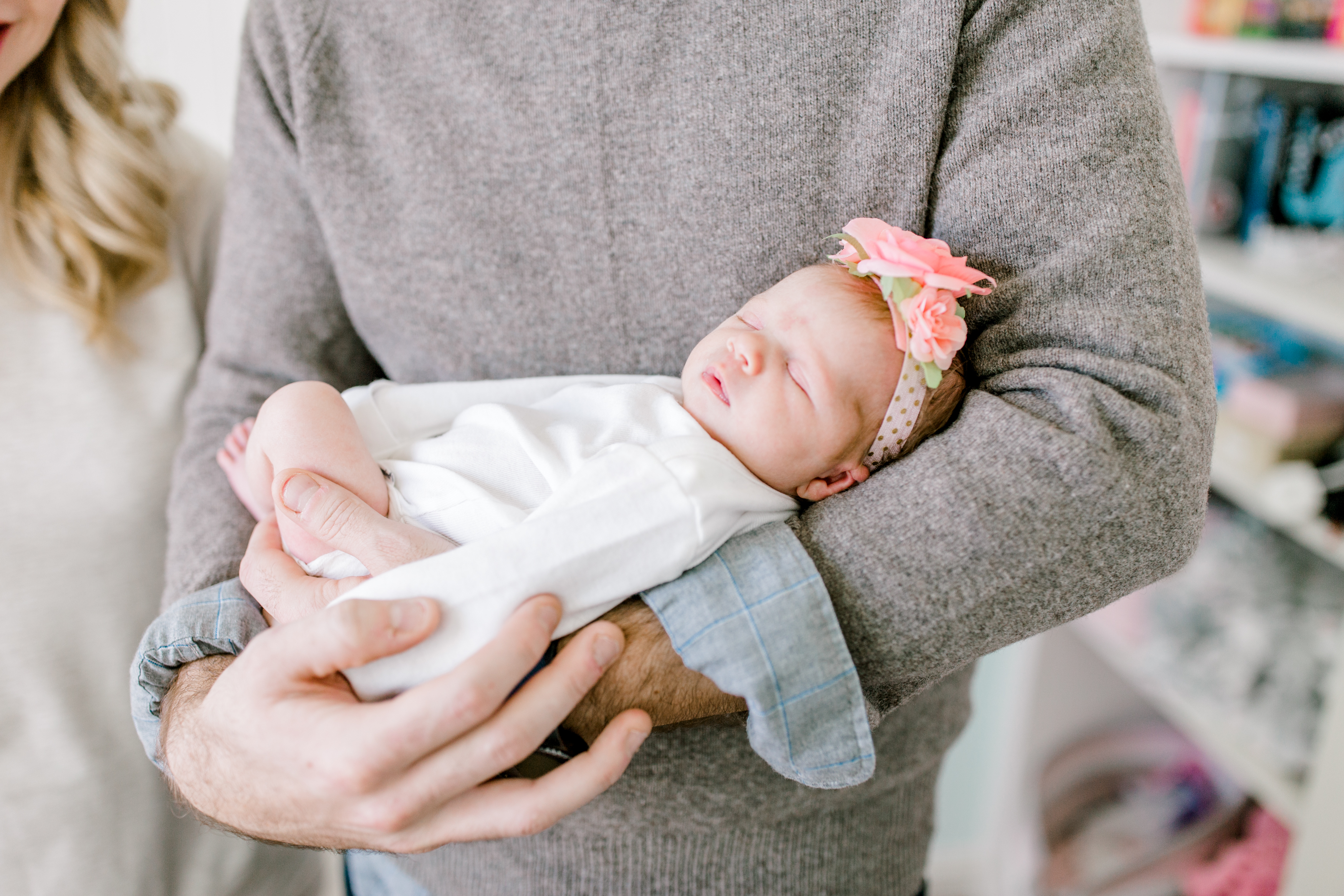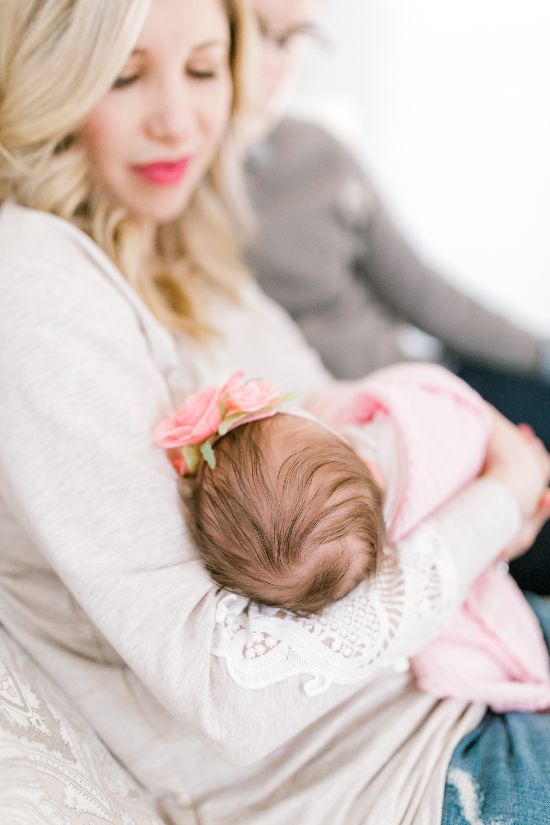 One of my favorite things about this session was that I was able to help design a beautiful wall collage of fine art matted prints to display in Baby Fiona’s room. Megan decided to hang it right above her rocking chair which I thought was the perfect spot. Even Fiona’s grandma was able to get her hands on some fine art prints from Baby Fiona’s newborn session. For most of the session, Baby Fiona was sleeping so I was able to capture some precious pictures of her and her parents. Wait until you see the one where she gave us the most precious little smile while in her mom’s arms! Fiona was wearing a flower headband, which I couldn’t get enough of. It was the perfect detail to a fabulous photoshoot.