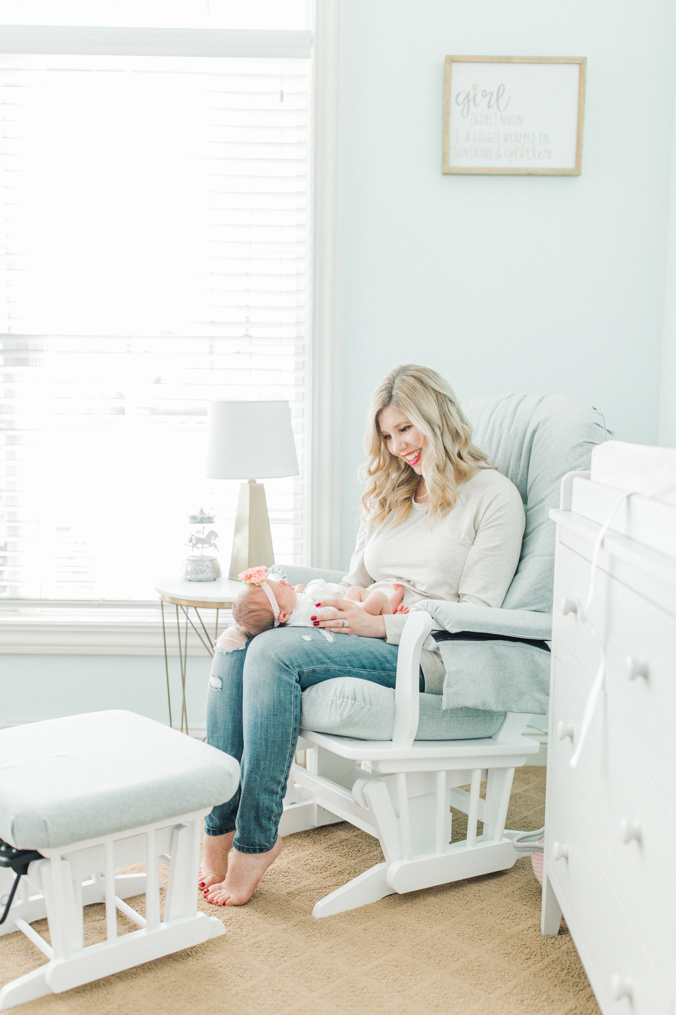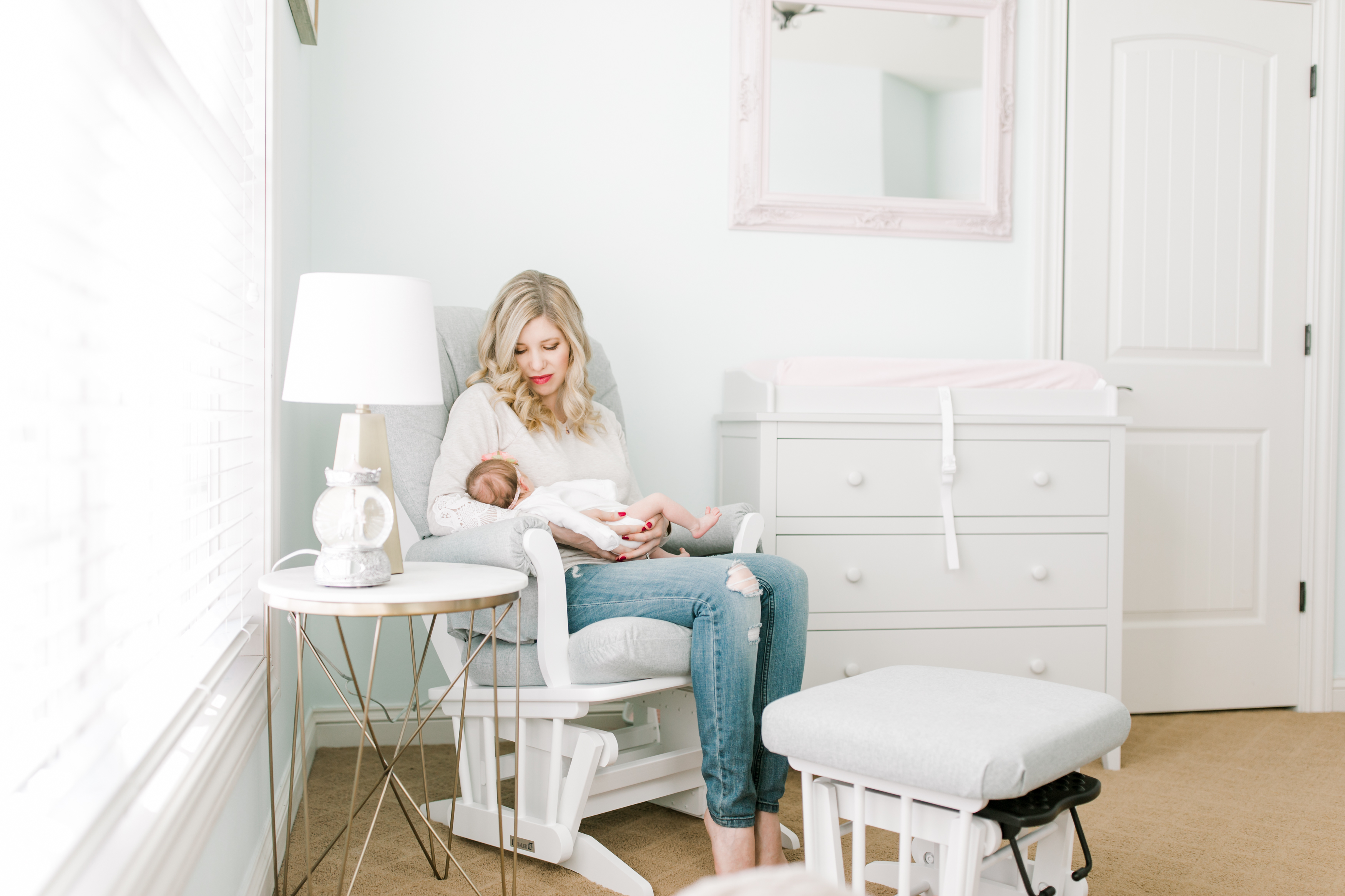 I got to meet the adorable Baby Fiona and her parents at their home in Oconomowoc, Wisconsin for their custom newborn session. They just welcomed in their first baby girl right around Christmas. And, to make things even more exciting, Fiona is their first child. Andy and Megan moved to Oconomowoc from Chicago. Andy is originally from Oconomowoc and always wanted to raise his children here. When they moved into their beautiful home in Pabst Farms, Andy decorated the nursery perfectly in mint and pink for their baby girl.
