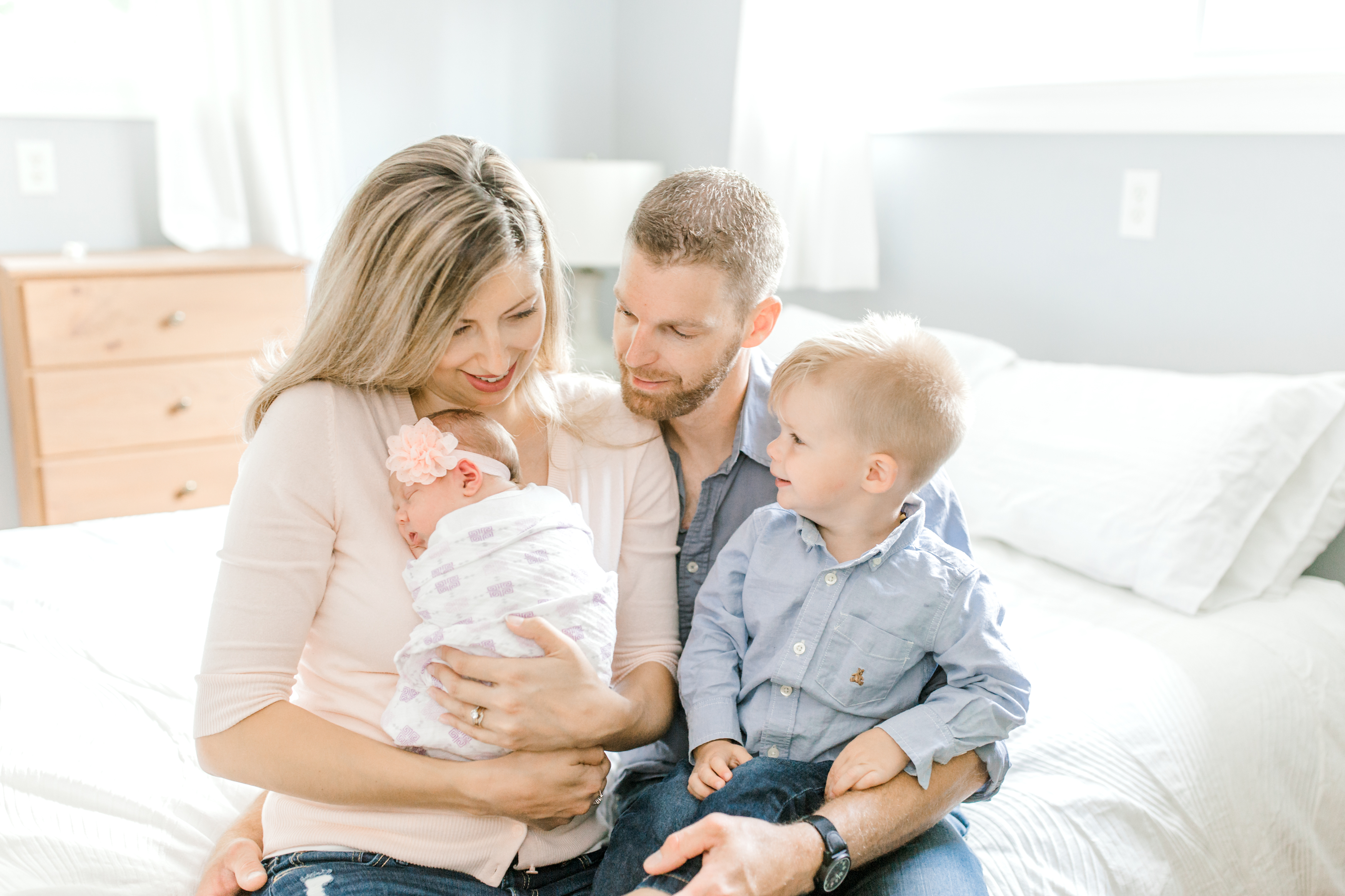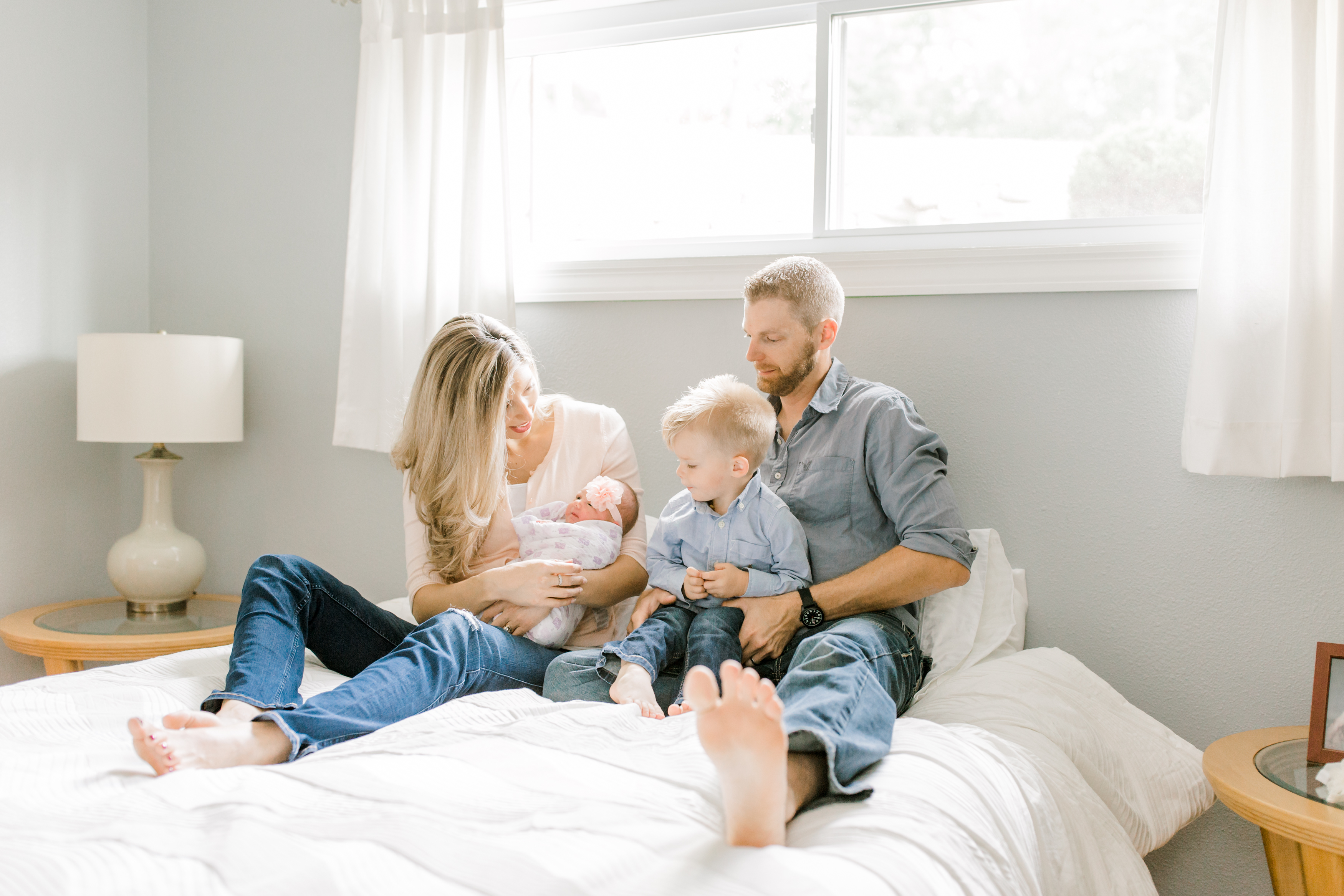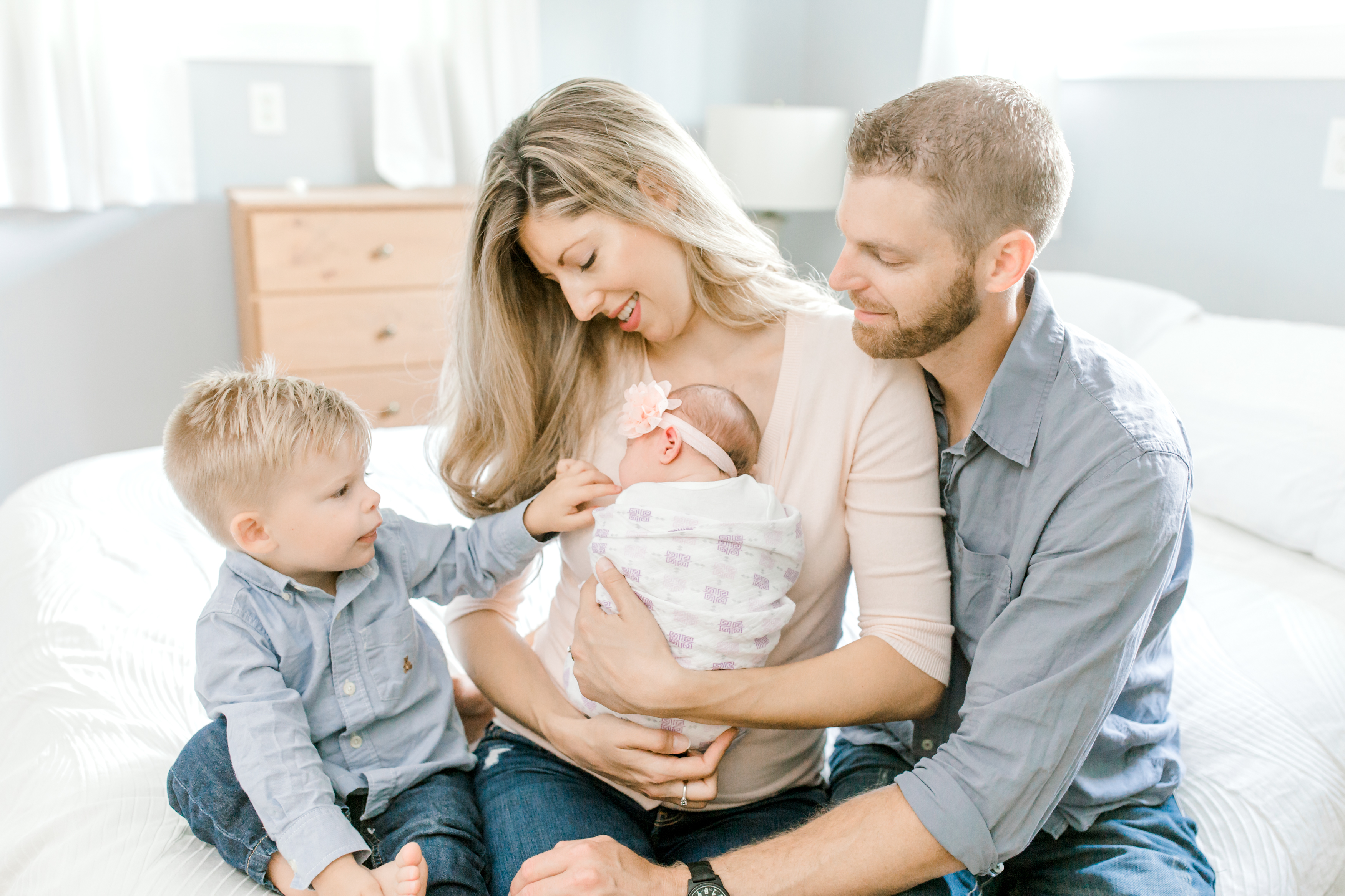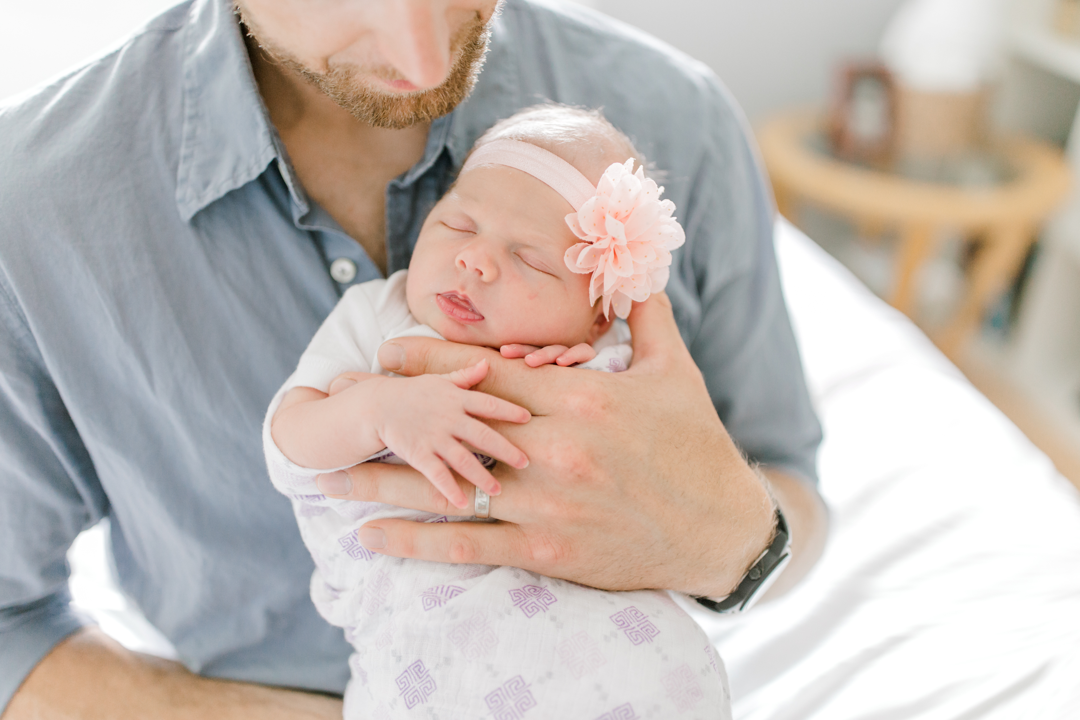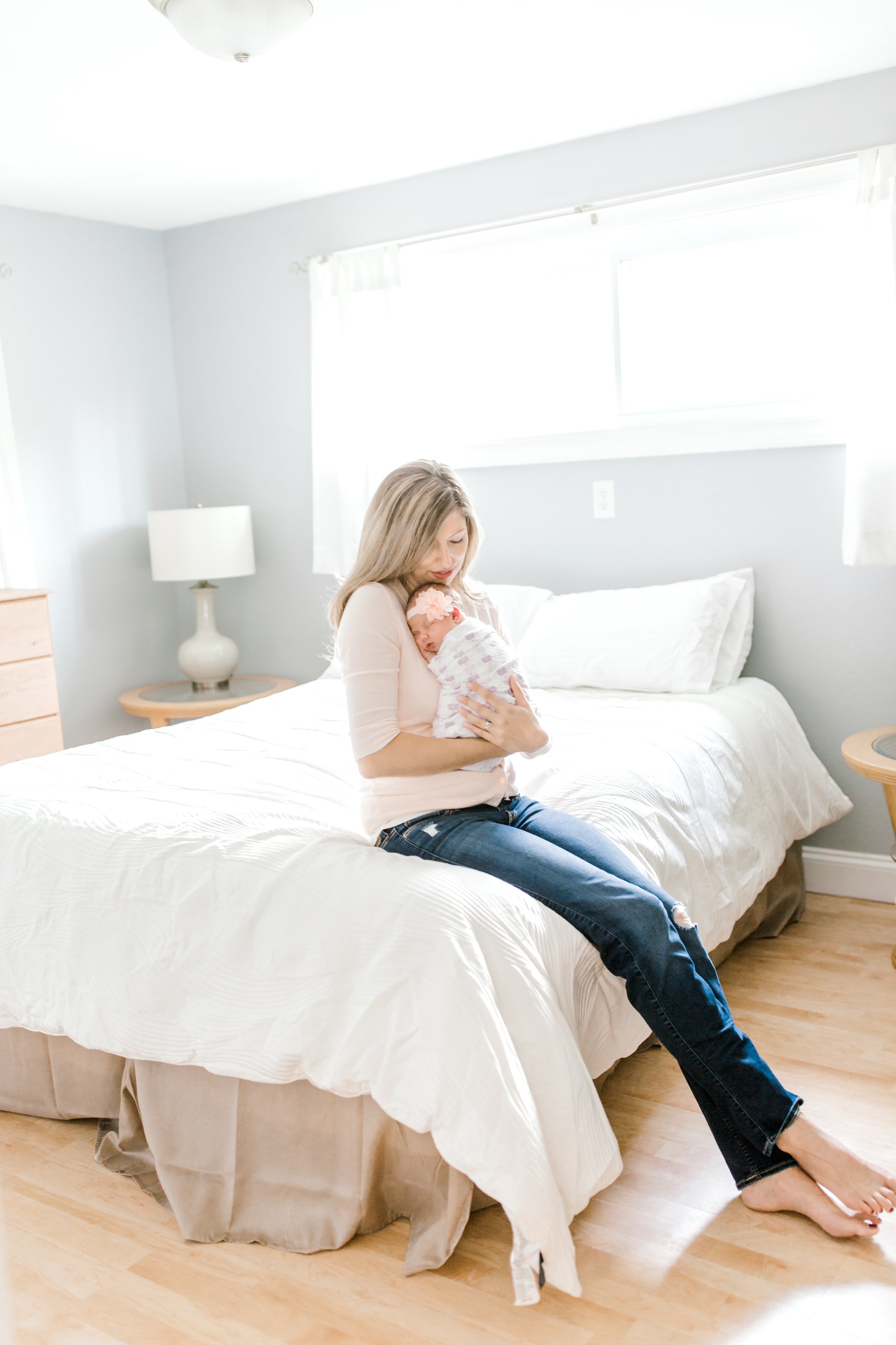 Finding the perfect room for the session is so important and we spent the weeks leading up to Stella’s birth planning out which room in the house we would use for her newborn photos. We decided on their beautiful bedroom because of it’s subtle and neutral colors. For all of my newborn sessions, I always spend time looking for rooms in the home that have both beautiful lighting and a soft colored, neutral palette. This helps keep the focus of the images on the family and their new baby, and not on other distracting elements.