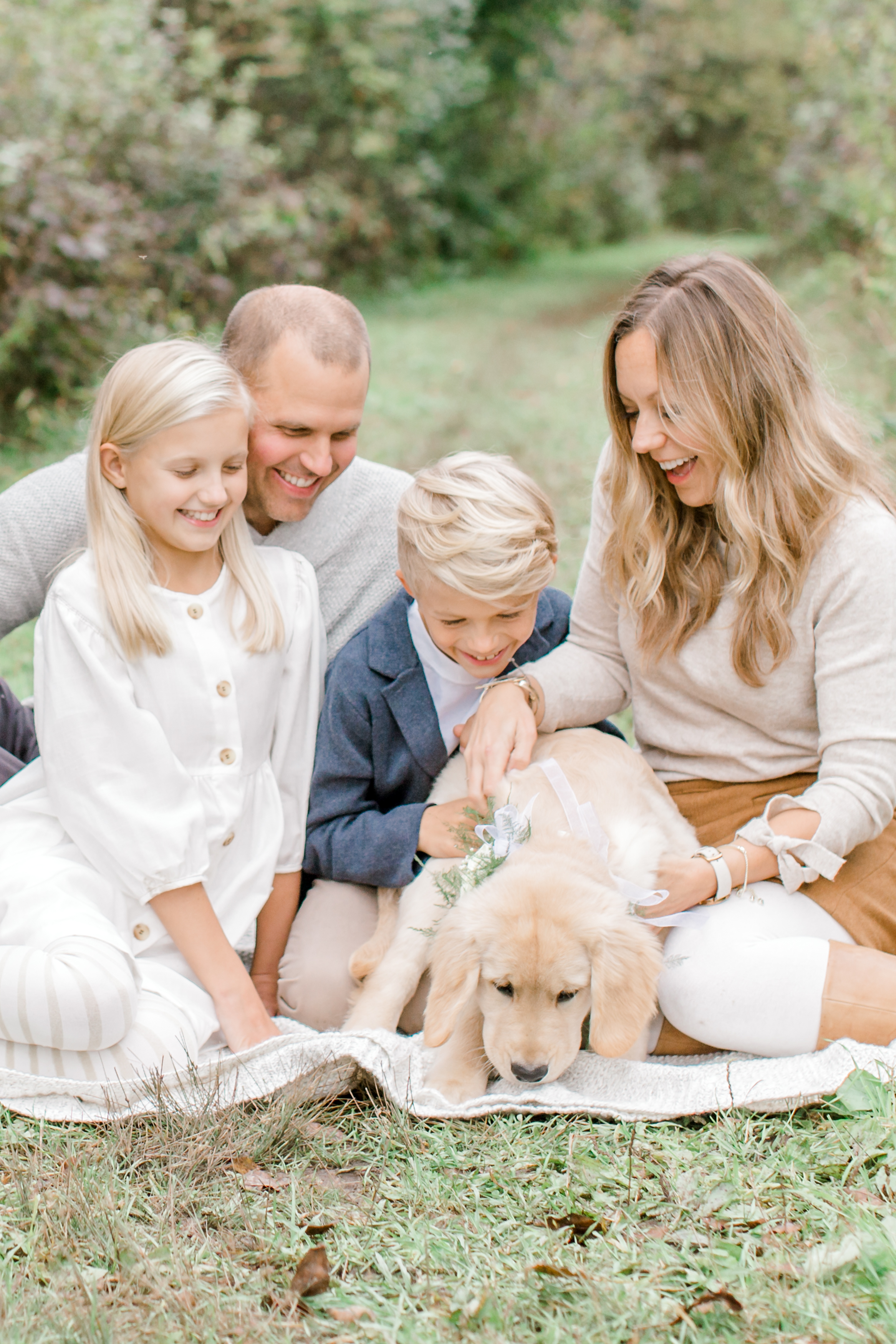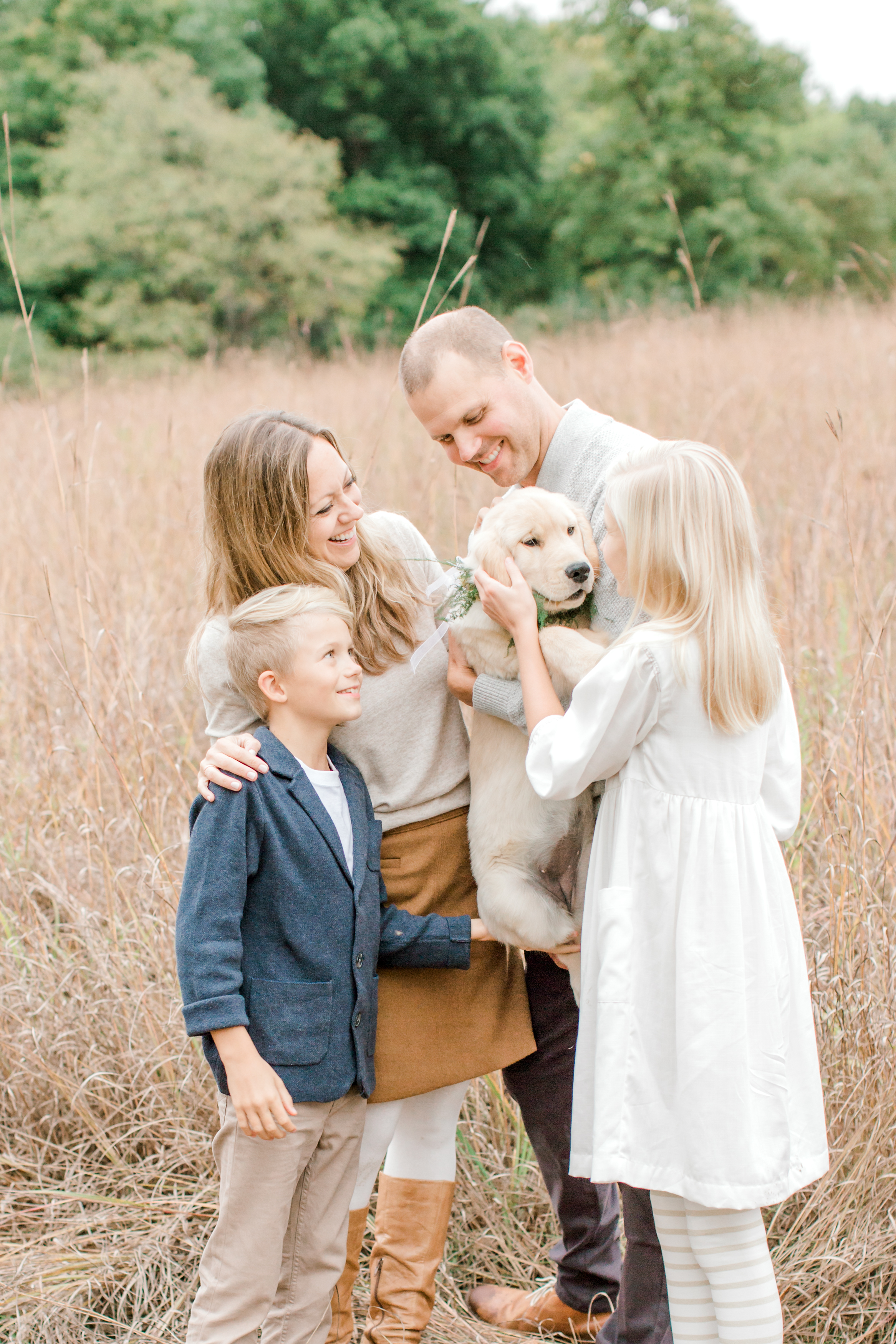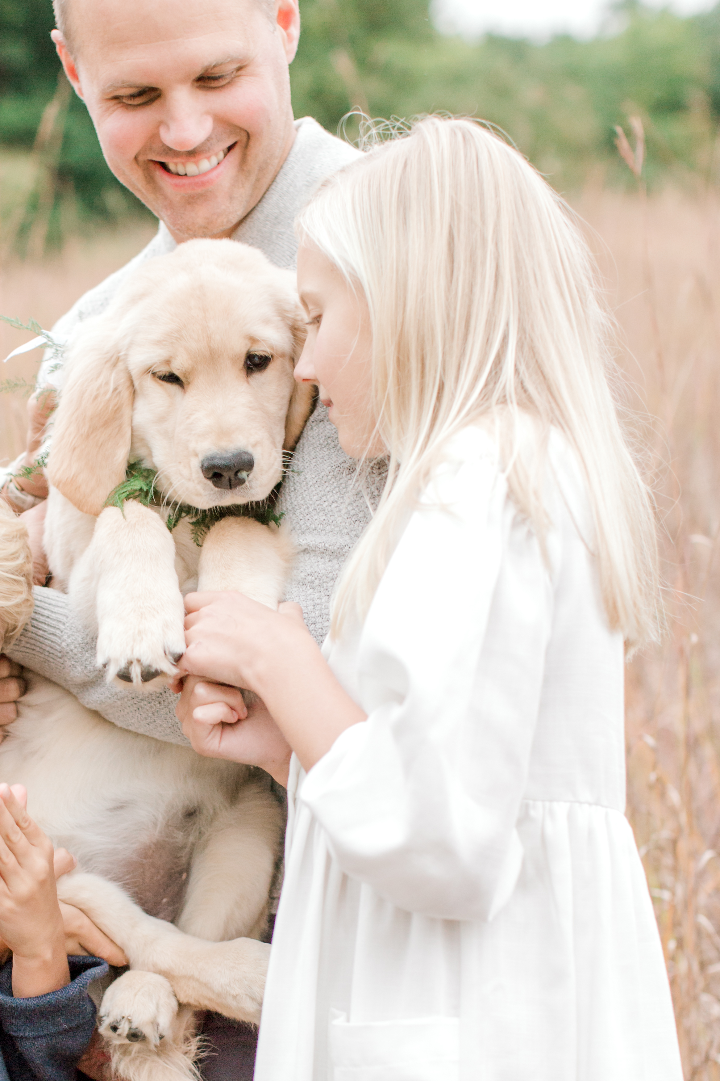 I met the Kujawski Family in Pewaukee, Wisconsin to celebrate the newest member of their family, their precious pup, Penny. When Michelle reached out and said they wanted to schedule a family session because they just got a new golden retriever puppy and wanted to document this stage with her, I was ALL IN!! There’s nothing I love more than a sweet family, snuggled up together in soft light, with a golden retriever! In addition, the amount of joy that this family shares toward each other and Penny, makes me remember how excited my family was when we brought home our dog. Man, do I love puppies!
