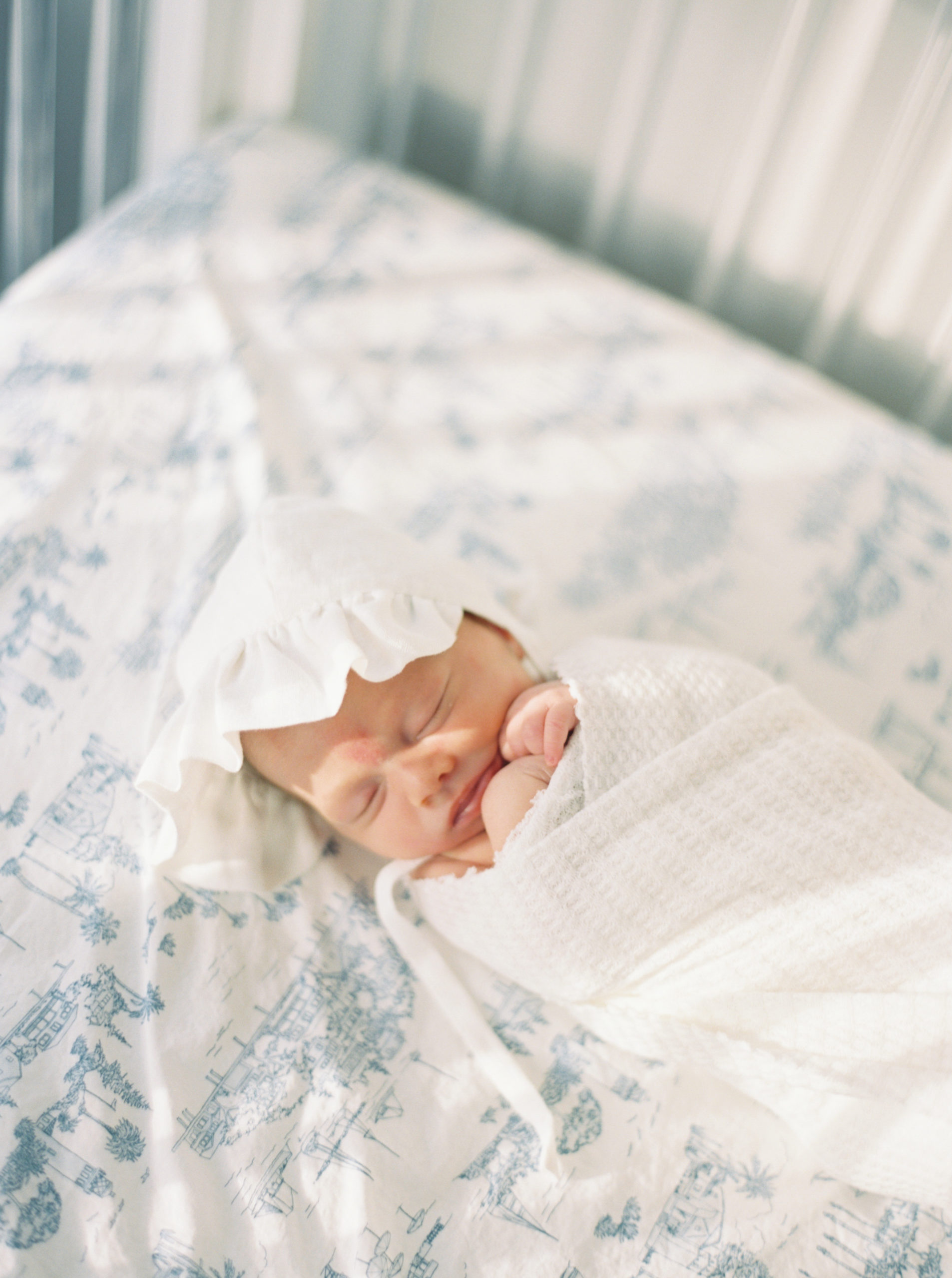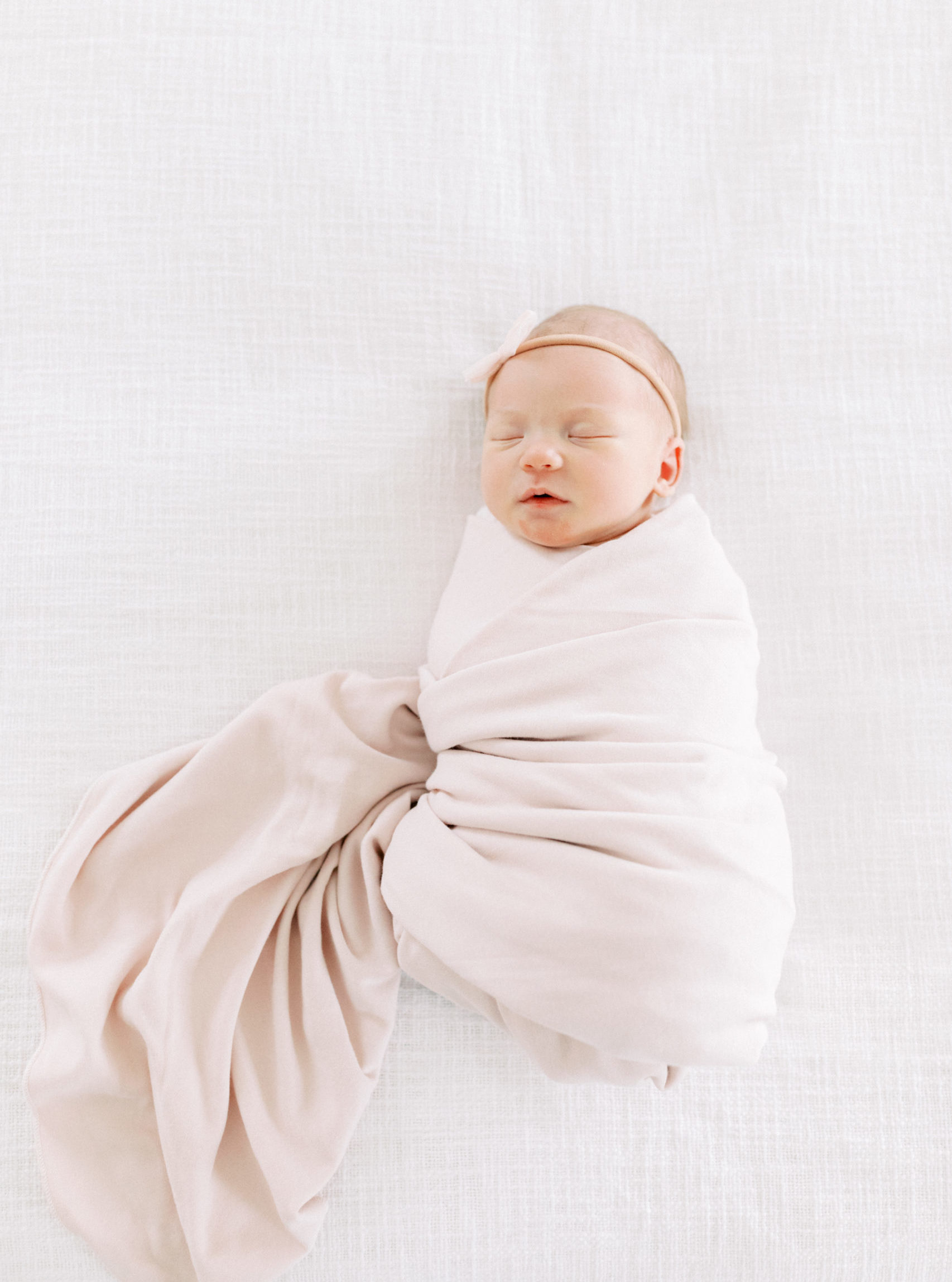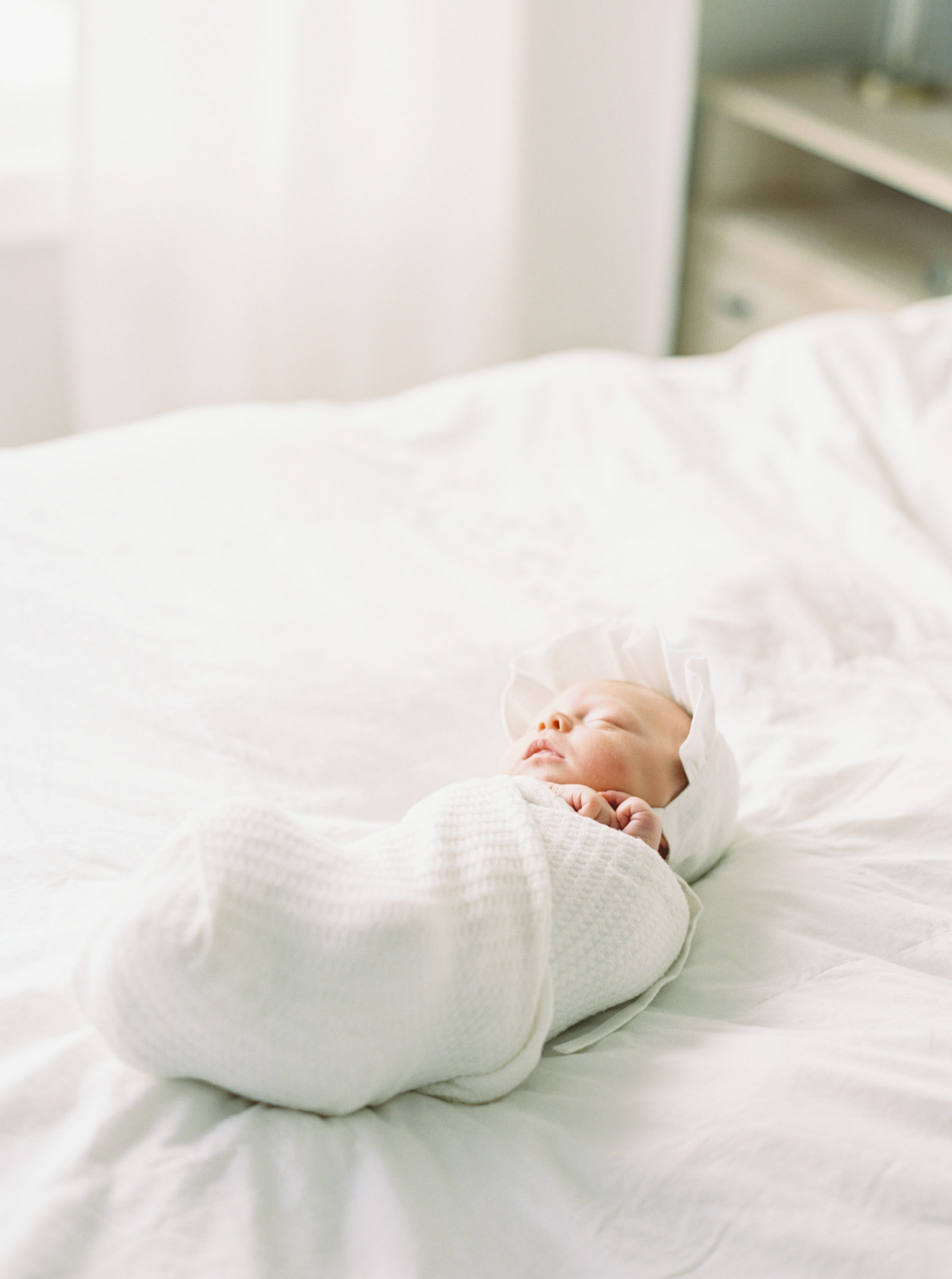 Lifestyle/baby led: The next style of photographer will create beautiful images of your baby, typically of baby sleeping in positions that are more natural and resemble the way your baby looks when sleeping in real life. This often includes images of a baby sleeping on the master bed, swaddled up in a crib or moses basket, snuggled up in dad’s arms or on mom’s chest, etc. You can see some samples of this style below.