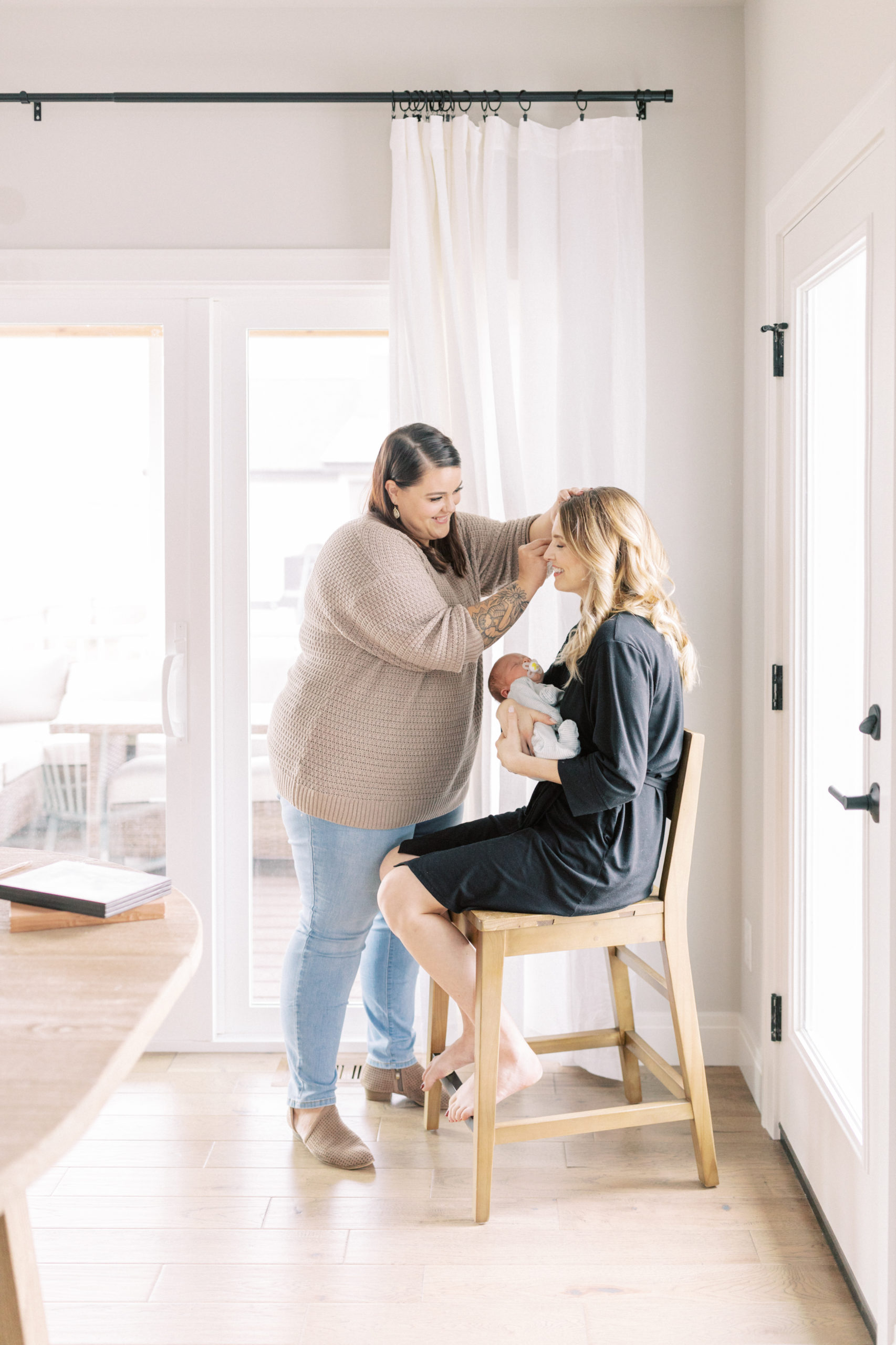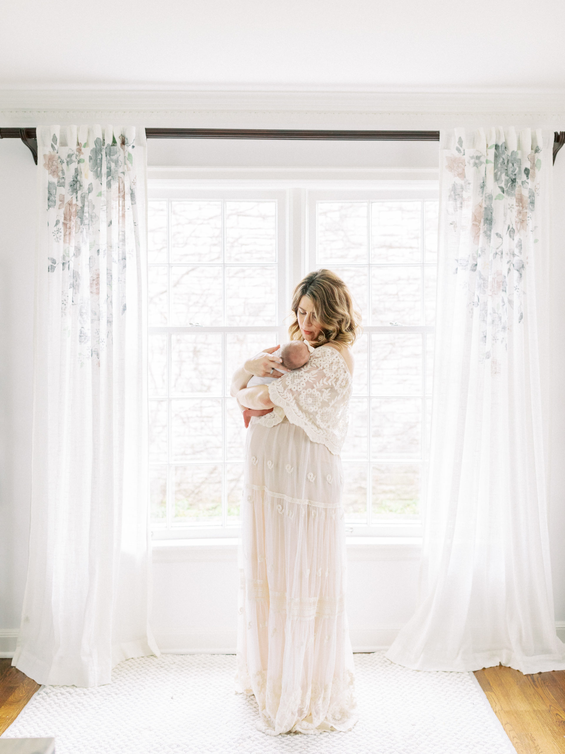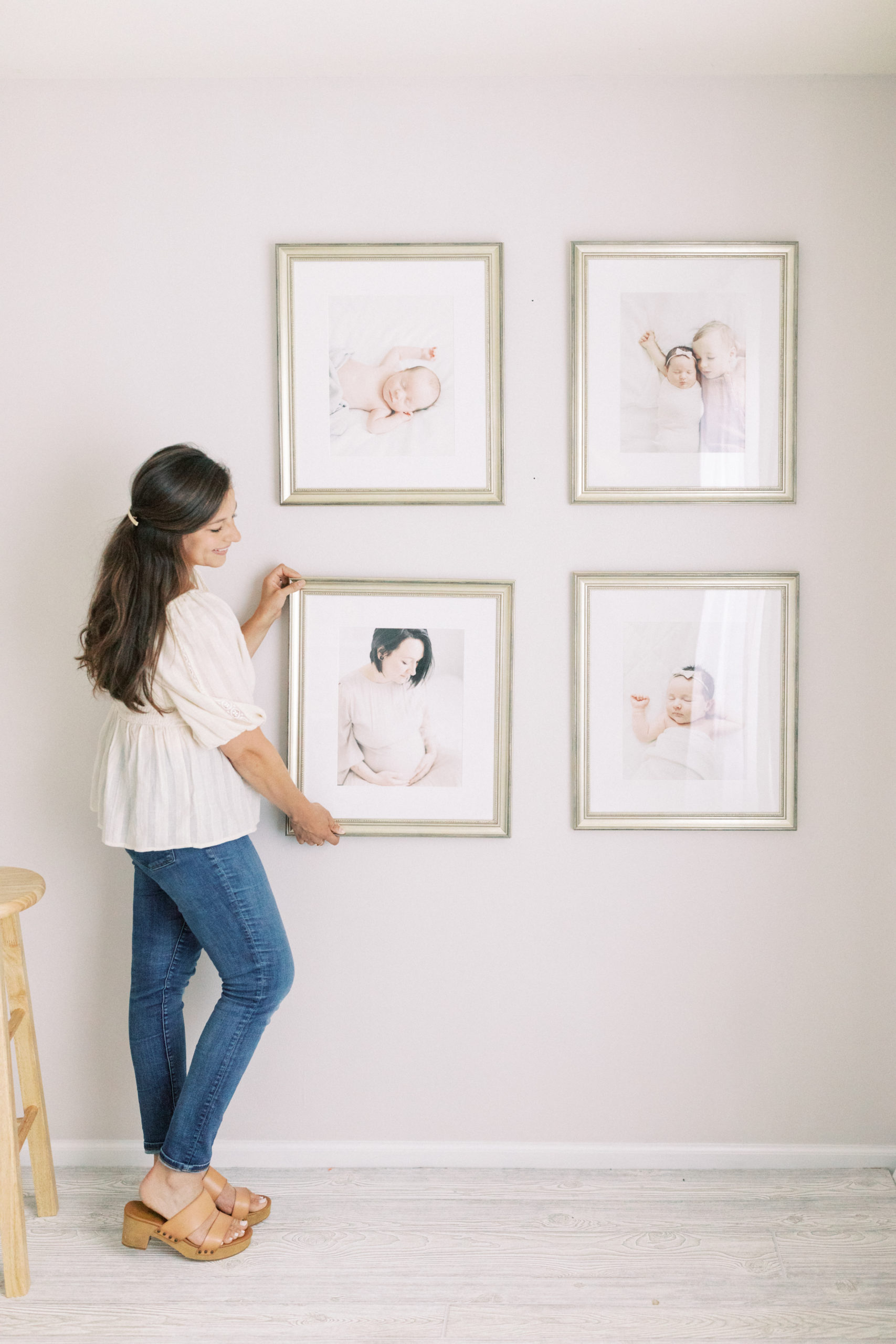 It’s session day and your photographer’s hair and makeup artist arrives. You snuggle your sweet newborn baby while you’re lovingly pampered with professional hair and makeup in the comfort of your own home. Your photographer arrives with your dress and all of the clothing steamed and ready to go. She helps your children get dressed, swaddles your new baby for you, and poses everyone in beautiful soft light (and even shoots film for the most flattering soft looking skin in your portraits). After your session, you meet with your photographer and she helps you narrow down your favorites. She also designed some gallery walls for that huge empty wall you’ve been meaning to get photos on for years. Everything is mocked up to scale and she has the most beautiful classy solid wood frame options. And better yet- she even does the framing for you and delivers the whole gallery wall ready to hang! No guessing on what sizes will look good or fit on the wall together, no DIY sloppy looking gallery walls; just a perfectly polished professionally done gallery wall that your family will be able to enjoy every single day. SO worth the investment.