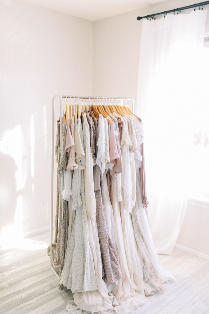 You commission your photographer, who sends you a beautiful welcome box with a portrait guide and luxurious gifts sourced locally from fair trade sustainable small businesses. You are invited in for your session planning meeting where your photographer has over 130 dresses in beautiful neutral tones and soft textures- wow, these dresses will surely create timeless, next level imagery! The photographer helps you select a dress that will be very flattering on you postpartum, and then even professionally styles your children with clothing that she provides. No shopping, no returns, no shipping things back, and better yet, the money you would’ve spent on high end clothing you’d only wear once can now be spent on that dreamy album you’ve been wanting for your coffee table!