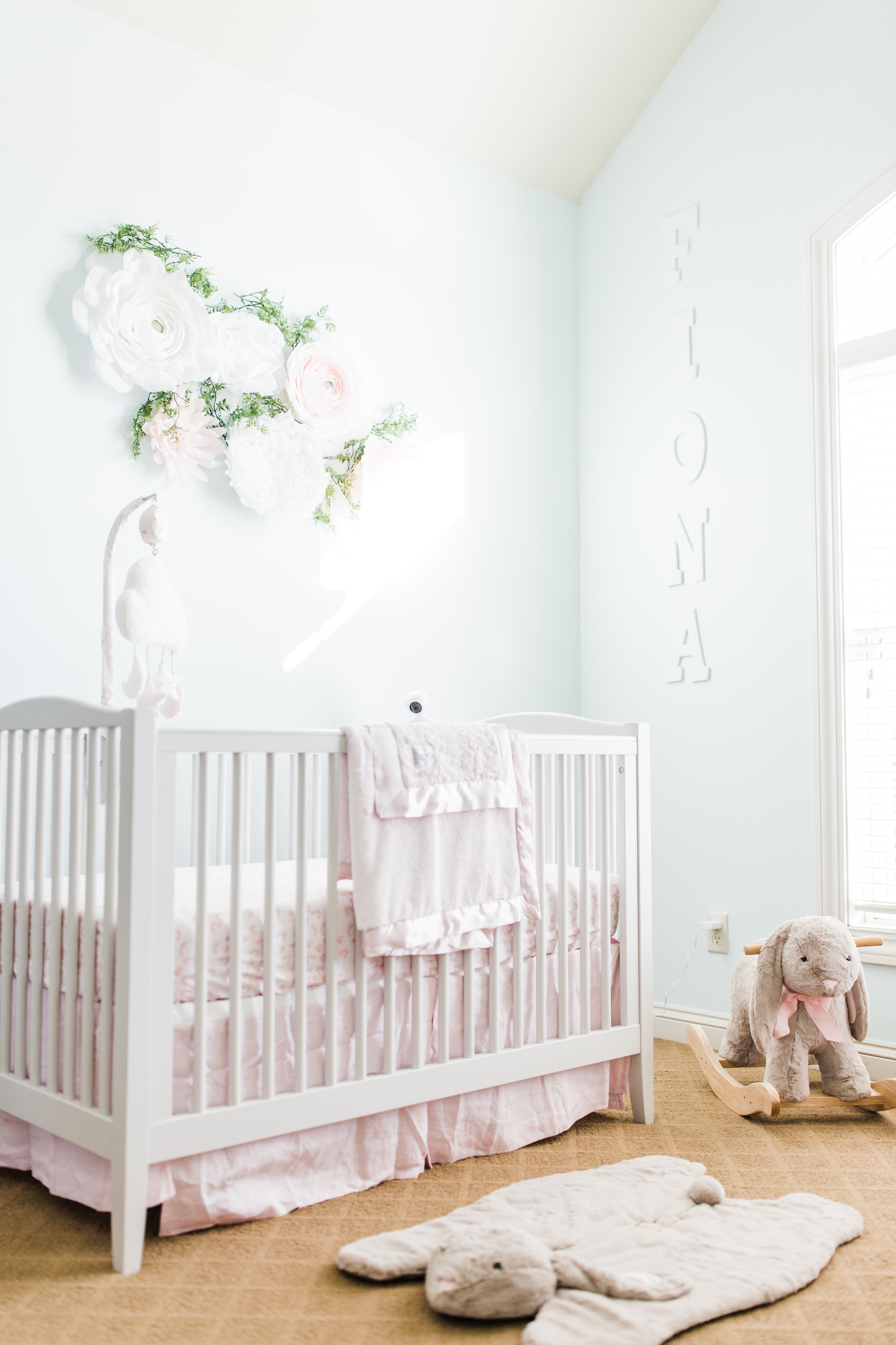 I suggest choosing a paint color that is soft and neutral so that it doesn’t reflect odd colors onto baby’s skin. Some families like to do an accent wall (with a wallpaper or stencil) to put the crib up against in a neat soft colored design which can look really nice (stay away from busy patterns).