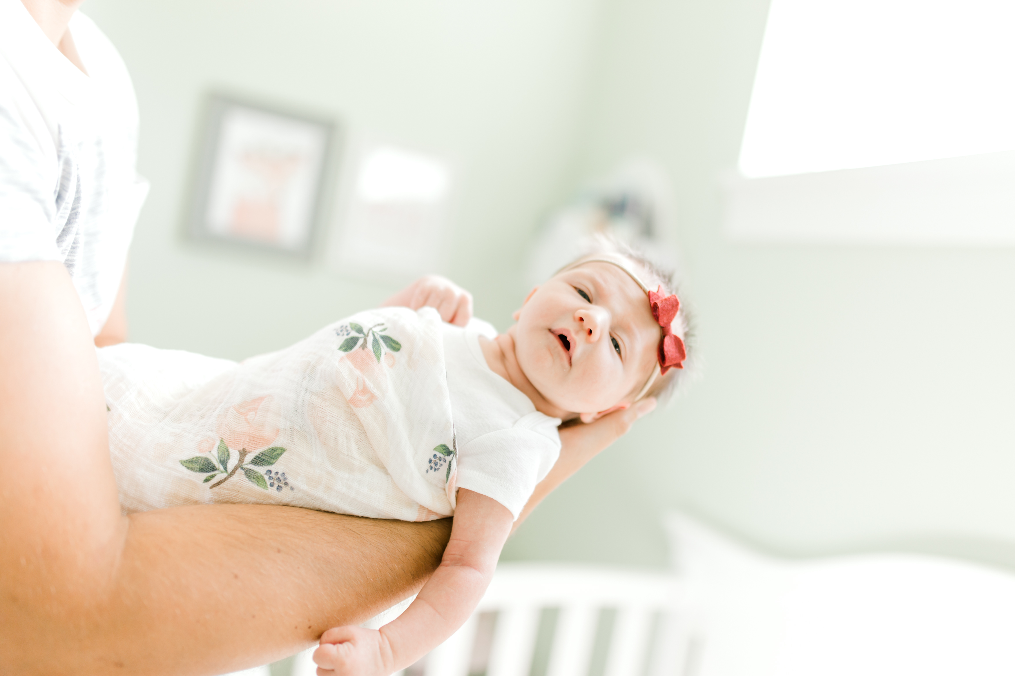 What should baby wear?! I absolutely love a classic onesy with a cute swaddle. This is the most timeless way to go! My suggestion is to avoid “cliche” outfit choices for baby (even though they make some really cute baby stuff), so that the main focus of your images is on you and your love for your newborn baby instead of the trendy outfit you put him/her in. I do think a fun swaddle or a dainty little headband/bow/hat is a great way to add in something a little extra pretty without overdoing it. (I love some of the softer colored swaddles from Little Unicorn and the headbands from Little Poppy Co or Hello Kait). Stear clear of anything with words on it or distracting patterns.