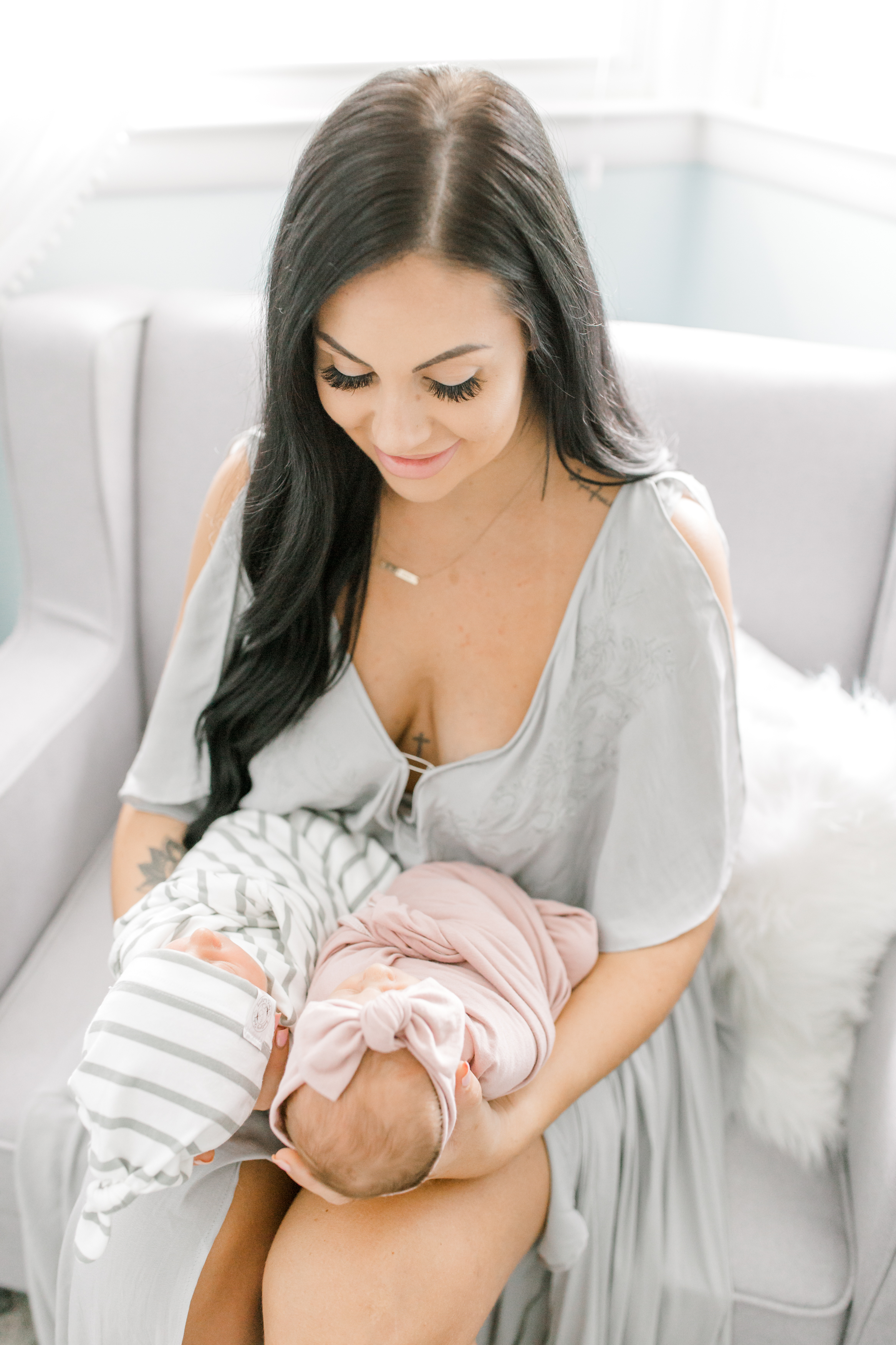 Don’t be afraid of wearing a soft dress for your newborn session (like the momma below did); they are always flattering on postpartum bodies and can help to hide a lot of the common insecurities. I also recommend wearing something with sleeves or at least a partial sleeve since a light sleeve can help give a little more coverage on the upper arms.